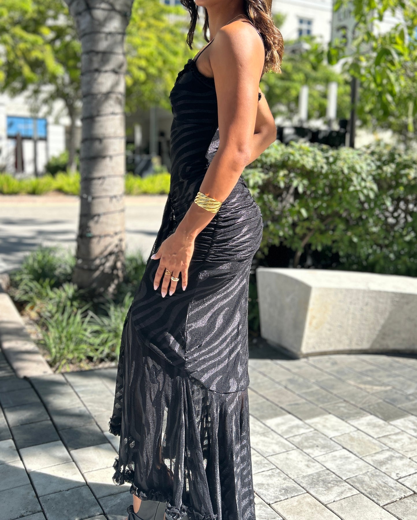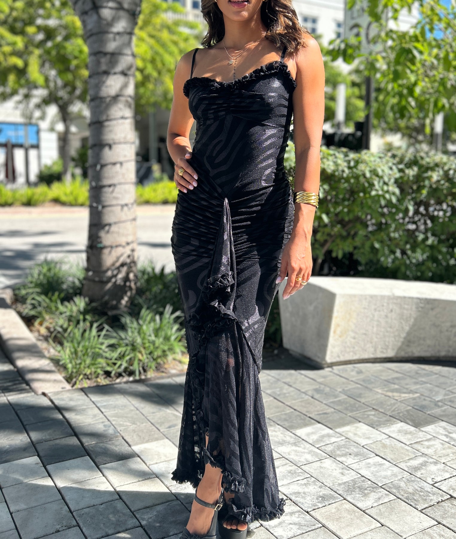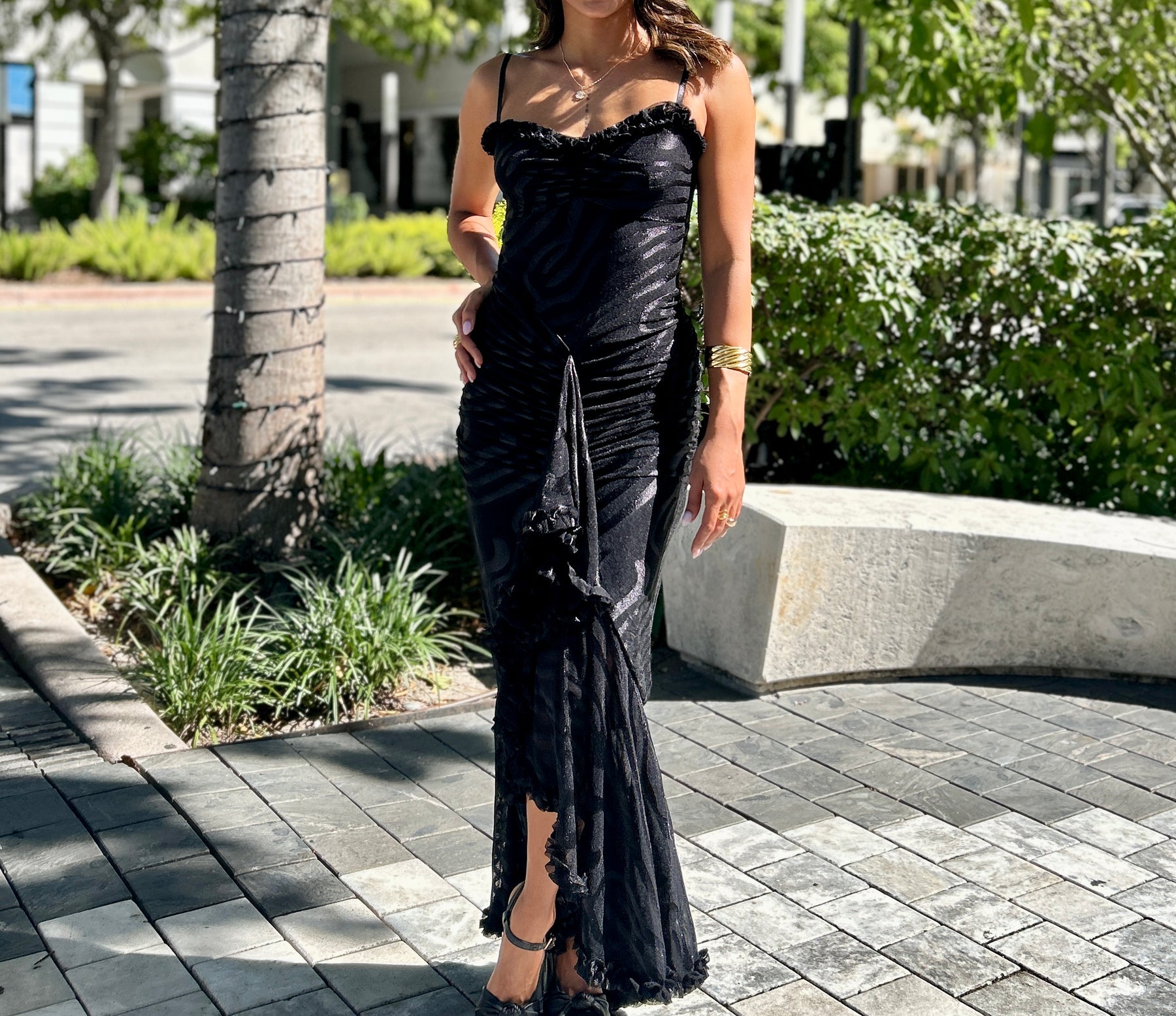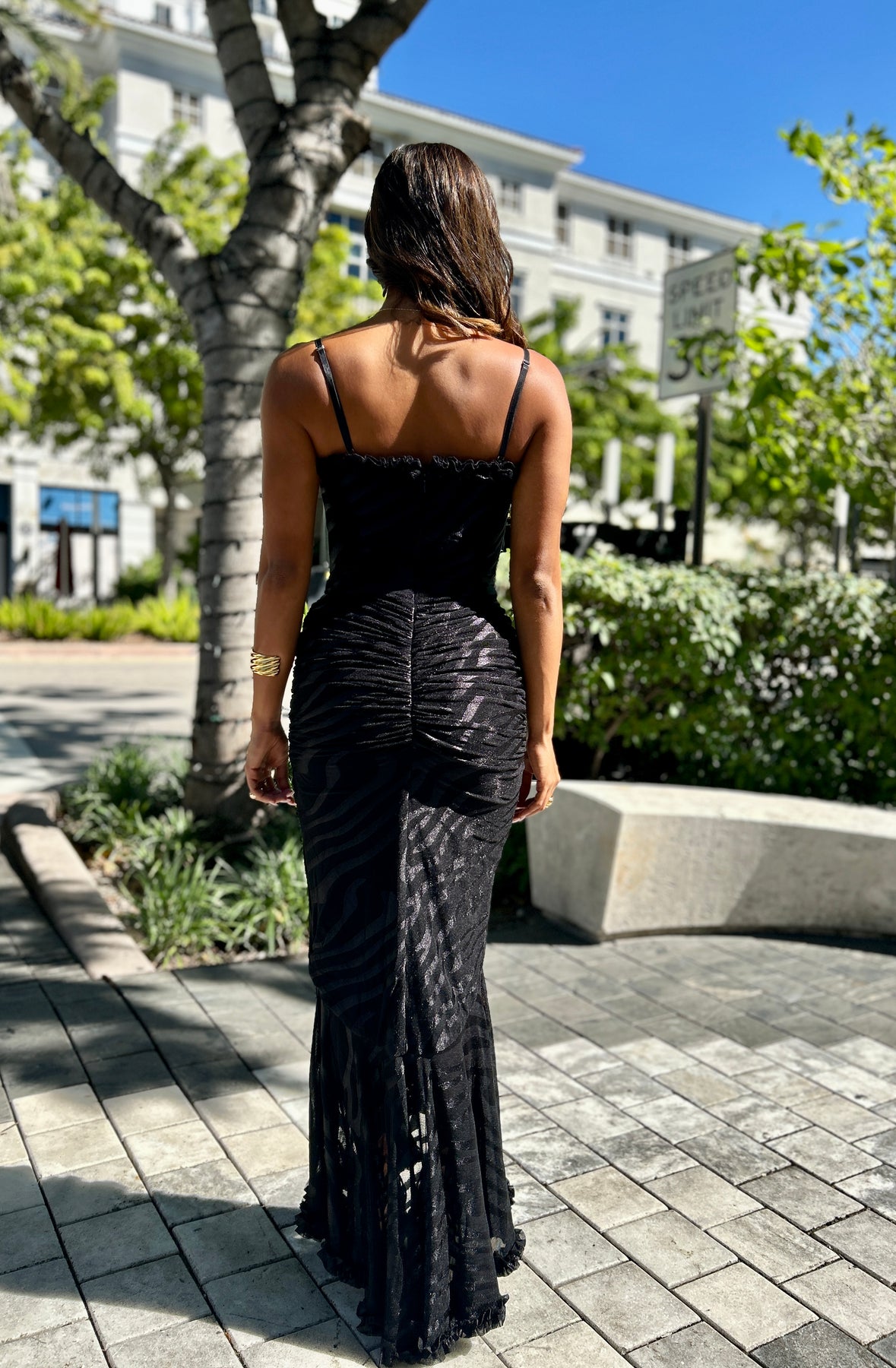 The Pamela Dress features a sophisticated shirred mesh ruffle design that enhances its elegance and visual appeal. Crafted from soft self and lining materials, it ensures a comfortable fit with gentle flexibility, allowing ease of movement throughout wear. This combination of style and comfort makes the dress an excellent choice for a variety of special occasions, from formal gatherings to evening events. Its refined construction and delicate details reflect expert tailoring designed to elevate your wardrobe with both grace and practicality.