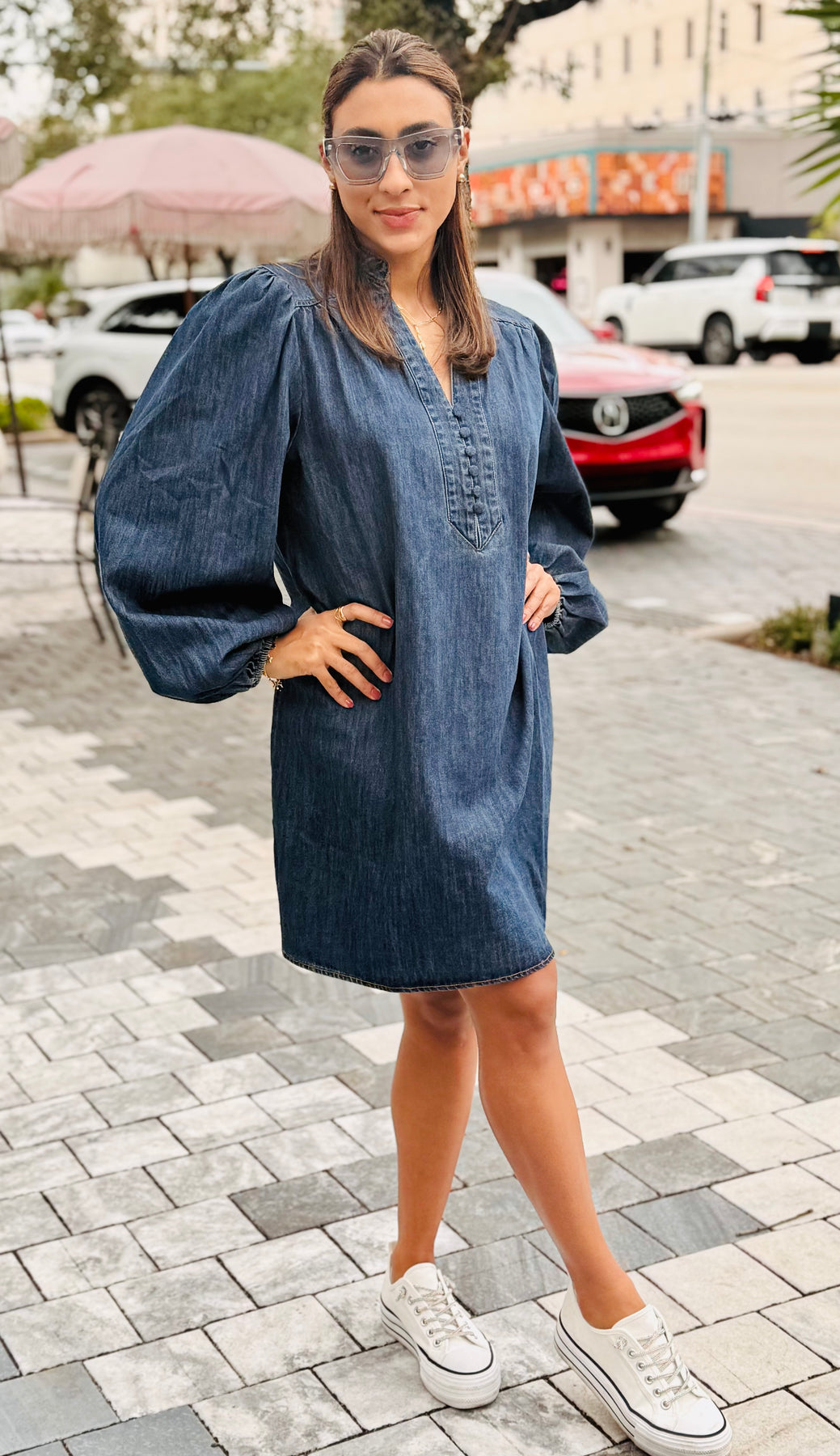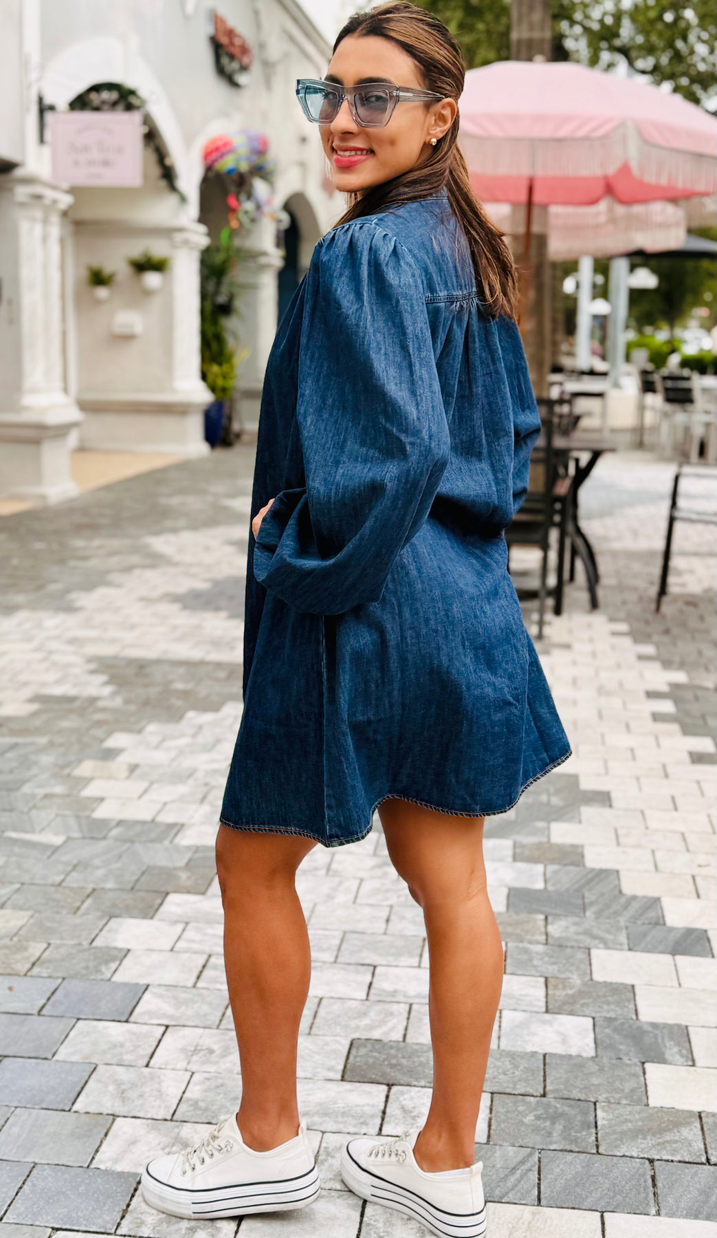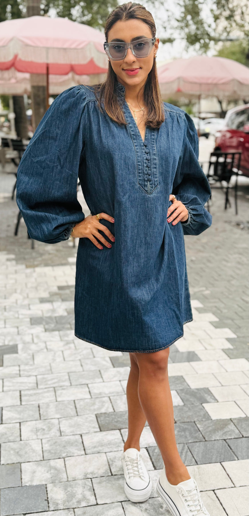 Crafted from top-notch fabric. Its front v-neckline and long sleeves, paired with a dark indigo hue, make this denim dress an effortless statement piece for any skin tone.