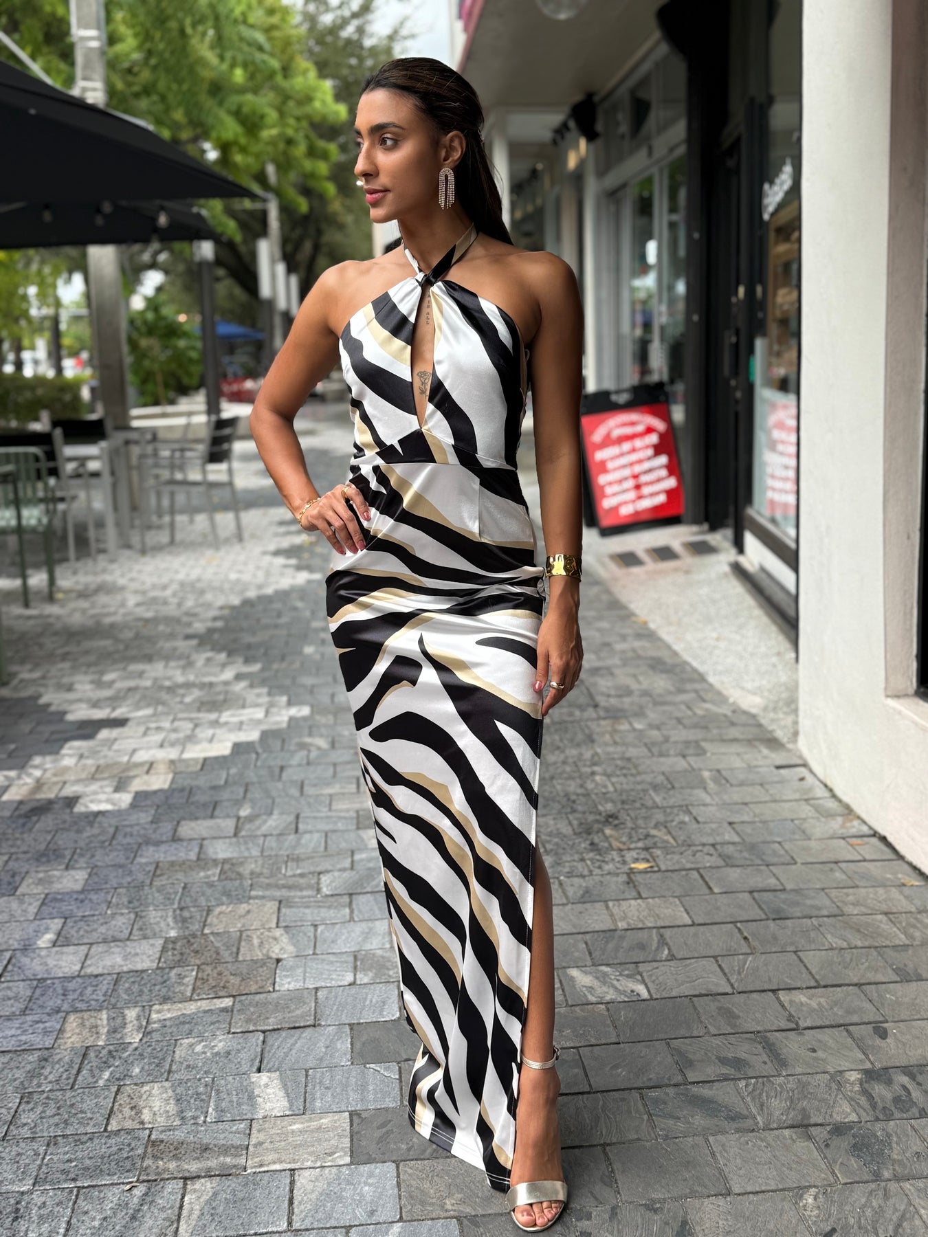 The Lucero Zebra print halter neck Dress is expertly made from 100% organic cotton, ensuring breathability and no exposure to harsh chemicals. The halter neck design offers superior shoulder and neck support, and the alluring zebra print adds a hint of exotic appeal to your wardrobe. It's ideal for those seeking a striking fashion statement with an environmentally-friendly touch.