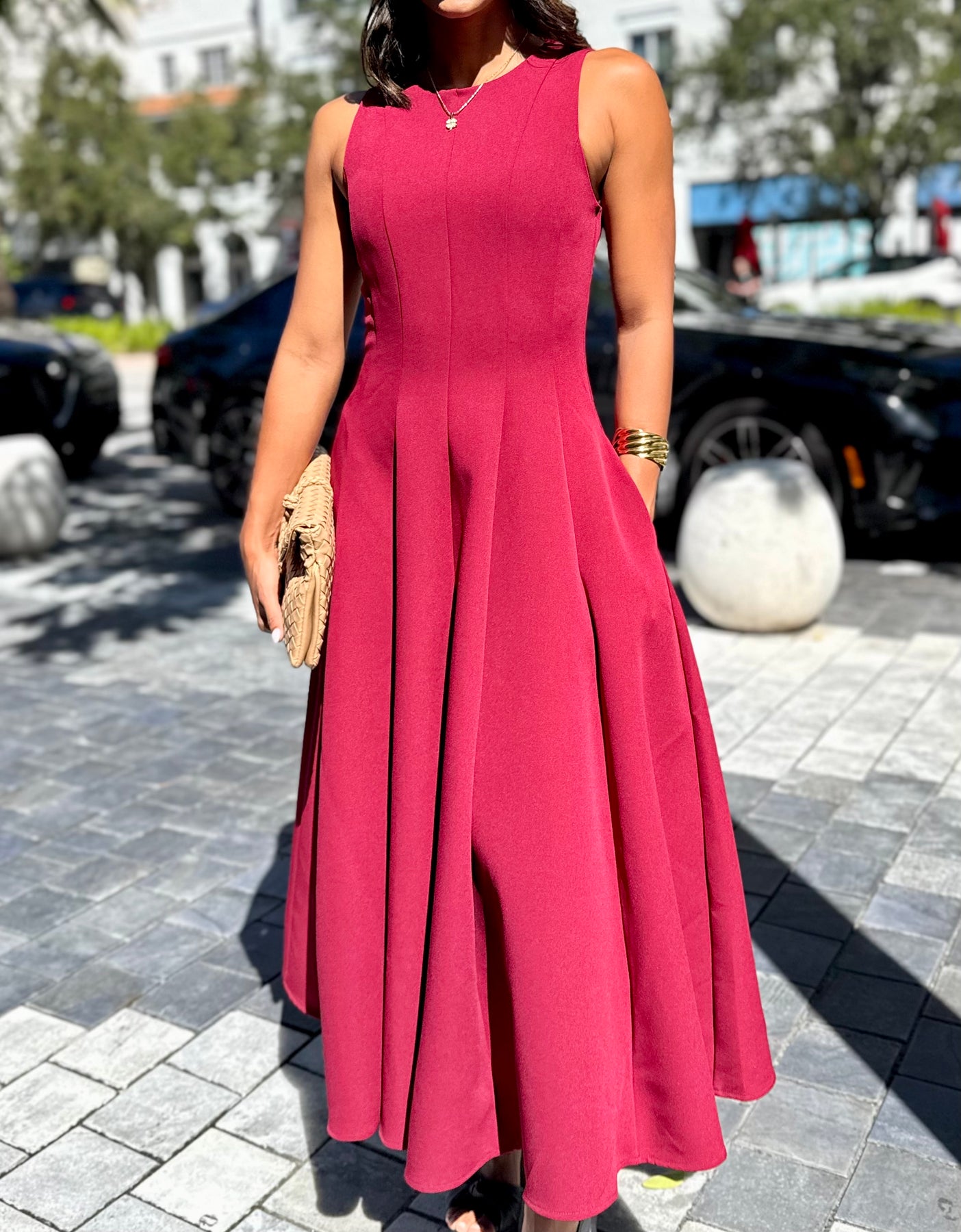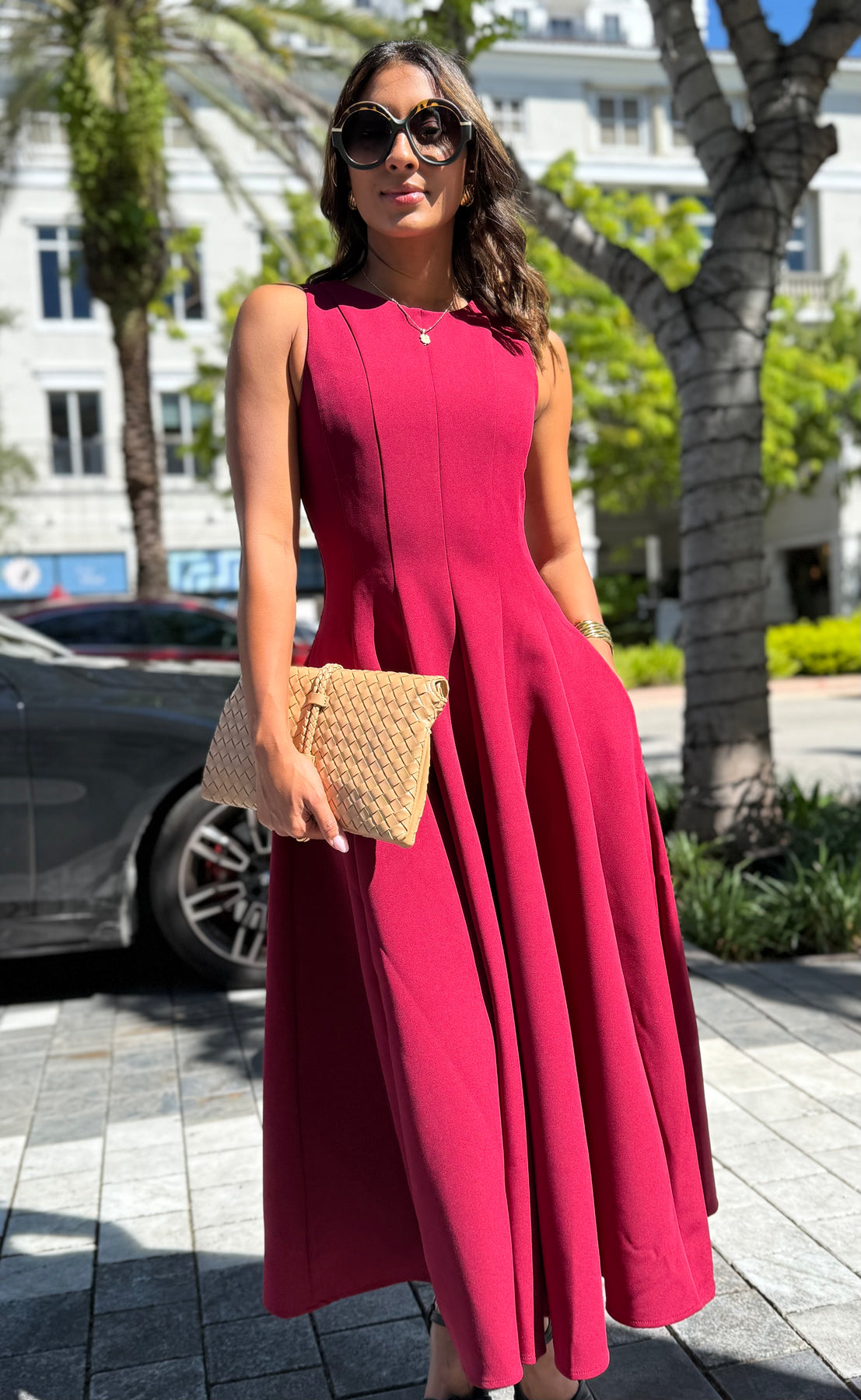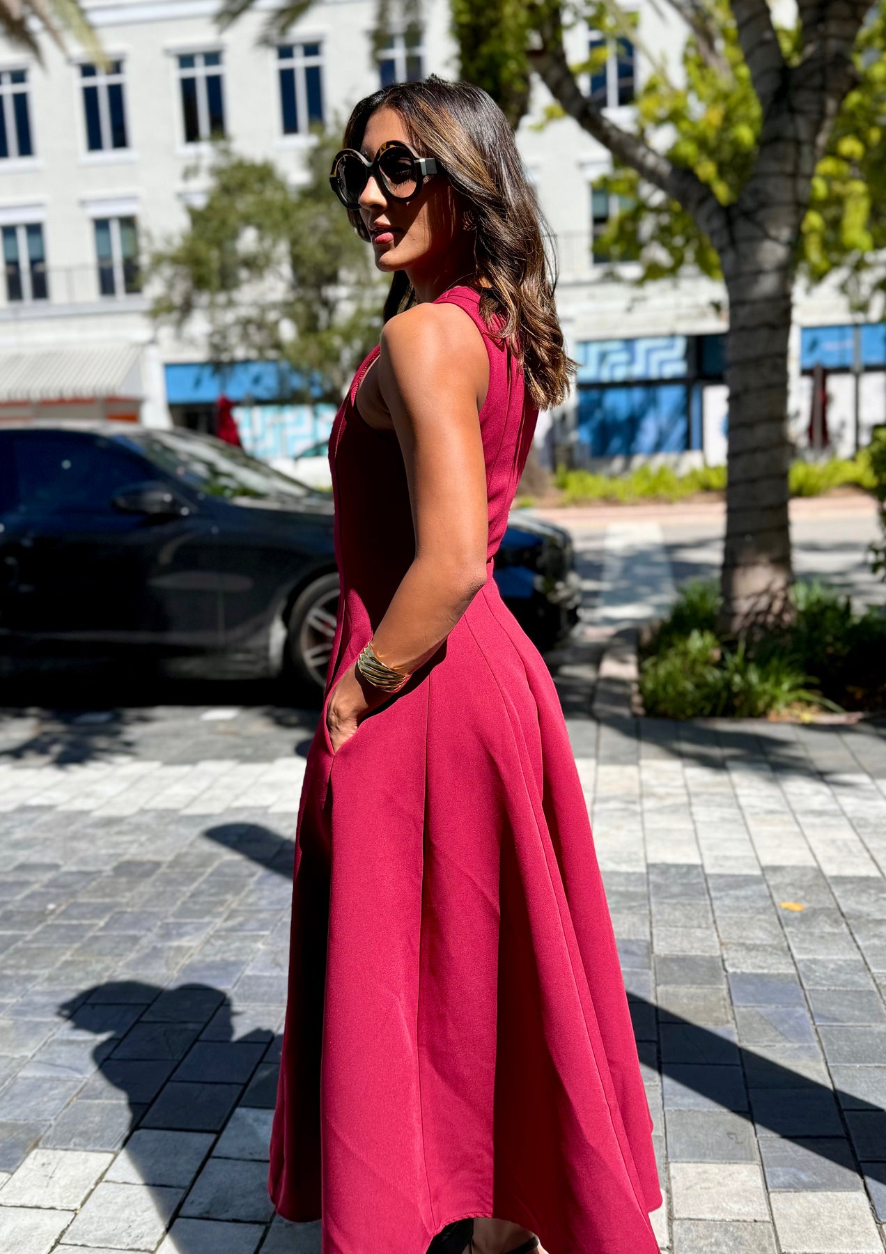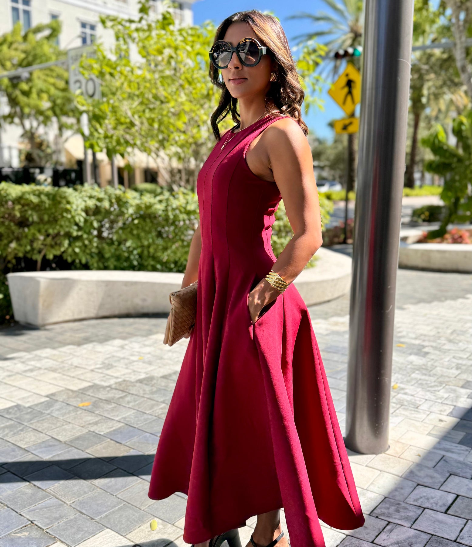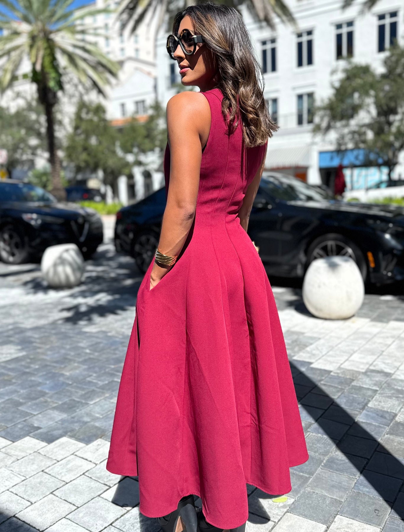 Expertly crafted from high-quality materials, the Fernanda Burgundy Midi Dress is the perfect blend of style and functionality. With its trendy midi length, convenient pockets, and elegant round neckline, this dress is the ideal choice for any occasion. Complete your look with the included necklace for a polished and sophisticated ensemble