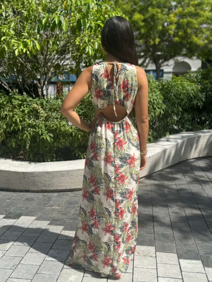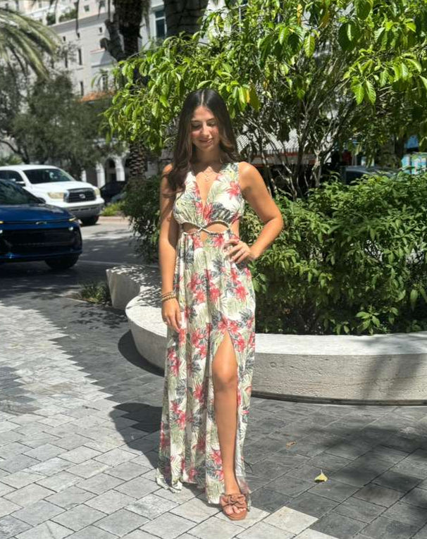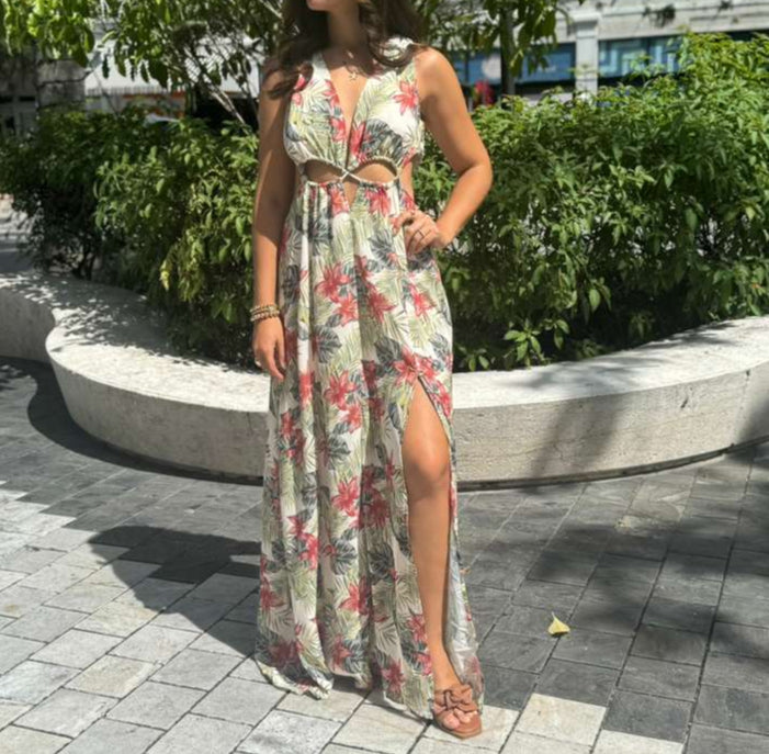 Introducing the Mykonos Chiffon Flared Maxi Dress, a beautiful addition to your wardrobe that features a v neck design and a stunning floral print. The airy chiffon fabric is perfect for summer, allowing you to stay cool and comfortable while still looking effortlessly stylish. Get ready to turn heads in this must-have dress.