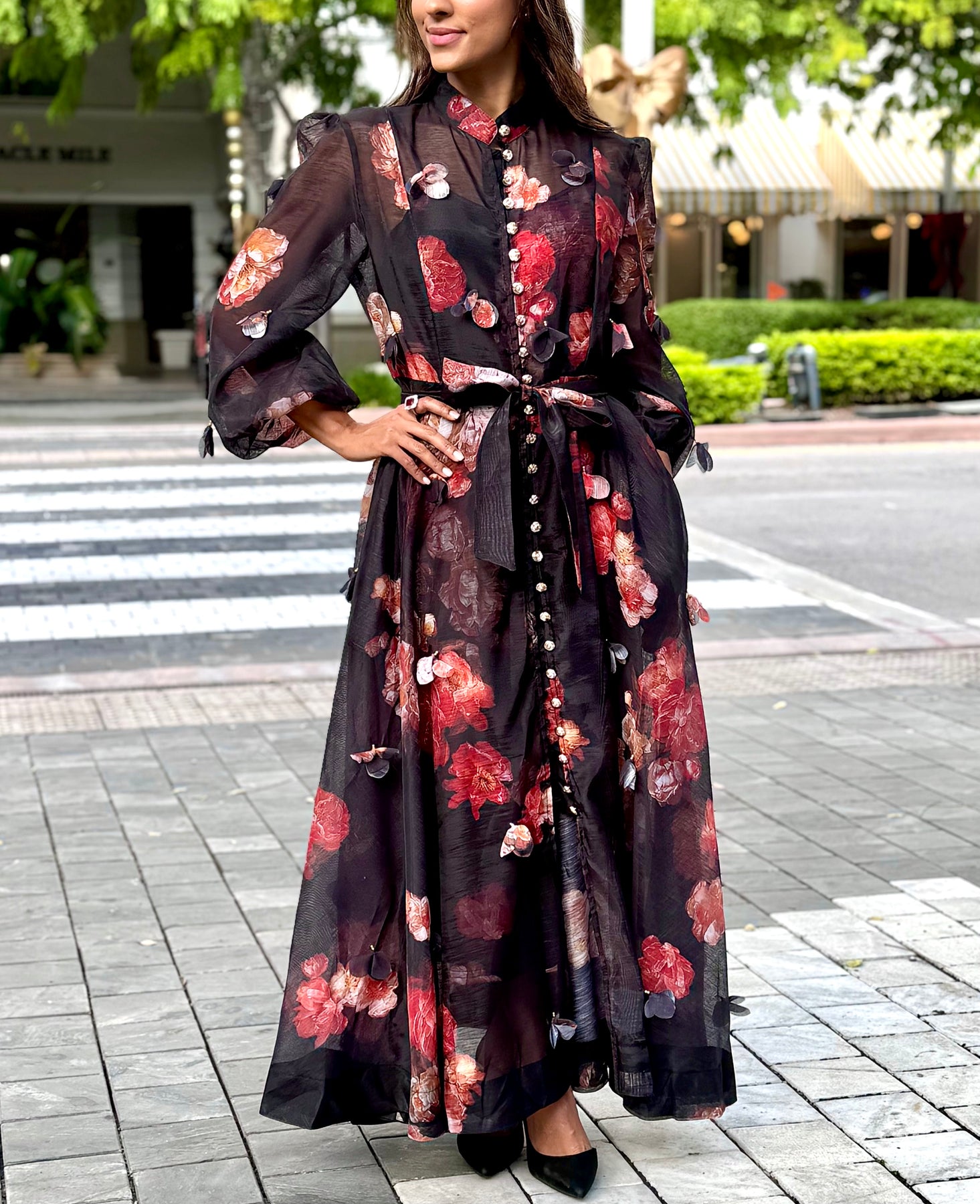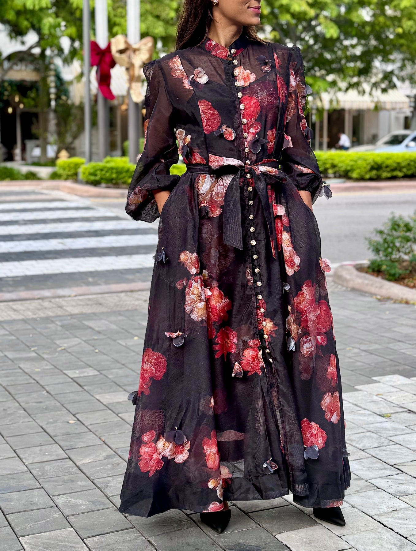 As an expert in fashion and style, I present to you the Rebeca Maxi Dress. This stunning dress features long sleeves, pockets, and a belted waist for a flattering fit. The gorgeous floral print in red and black with intricate detailing makes this dress a must-have. With a button-down front, this dress exudes elegance and practicality.