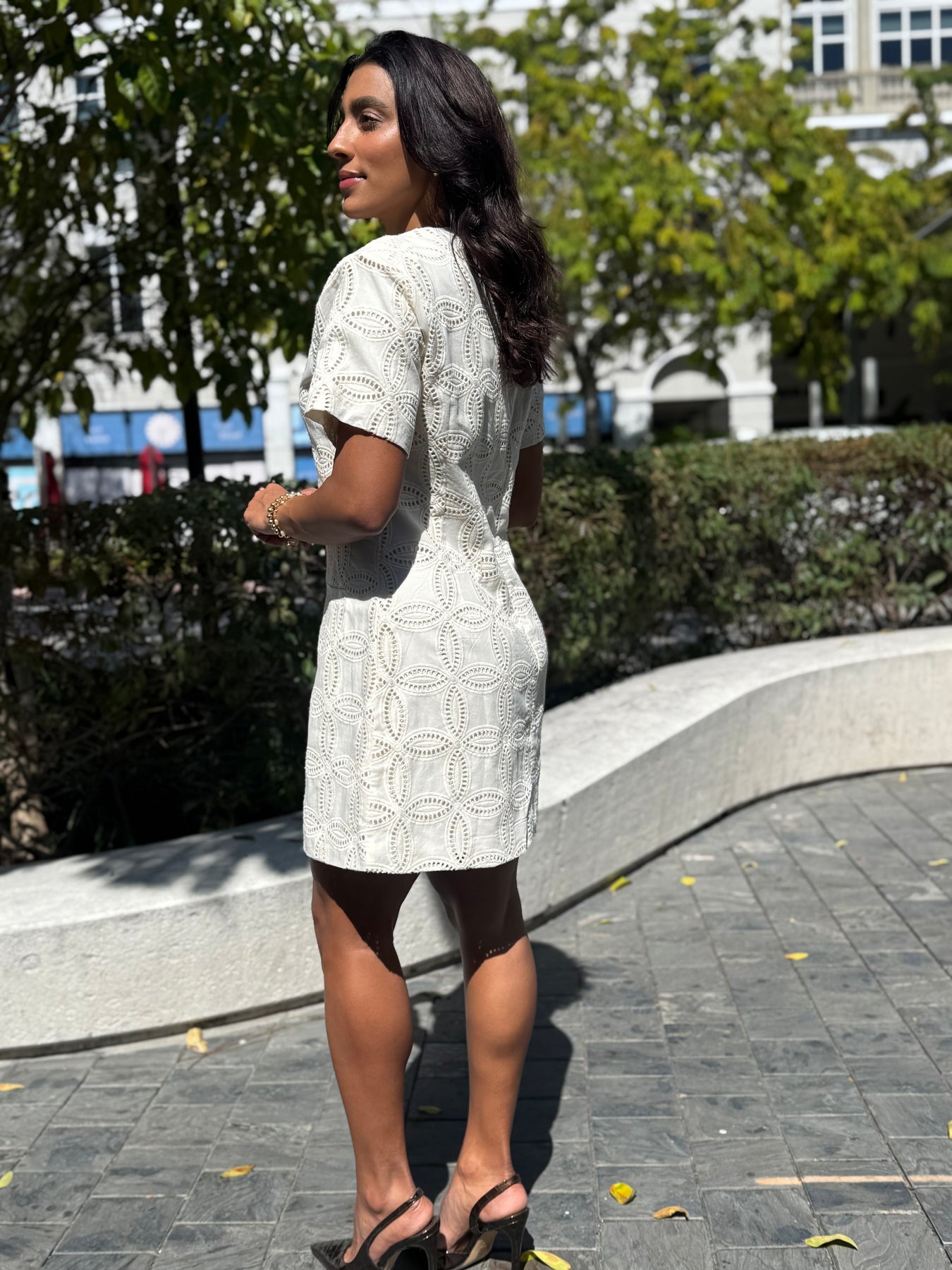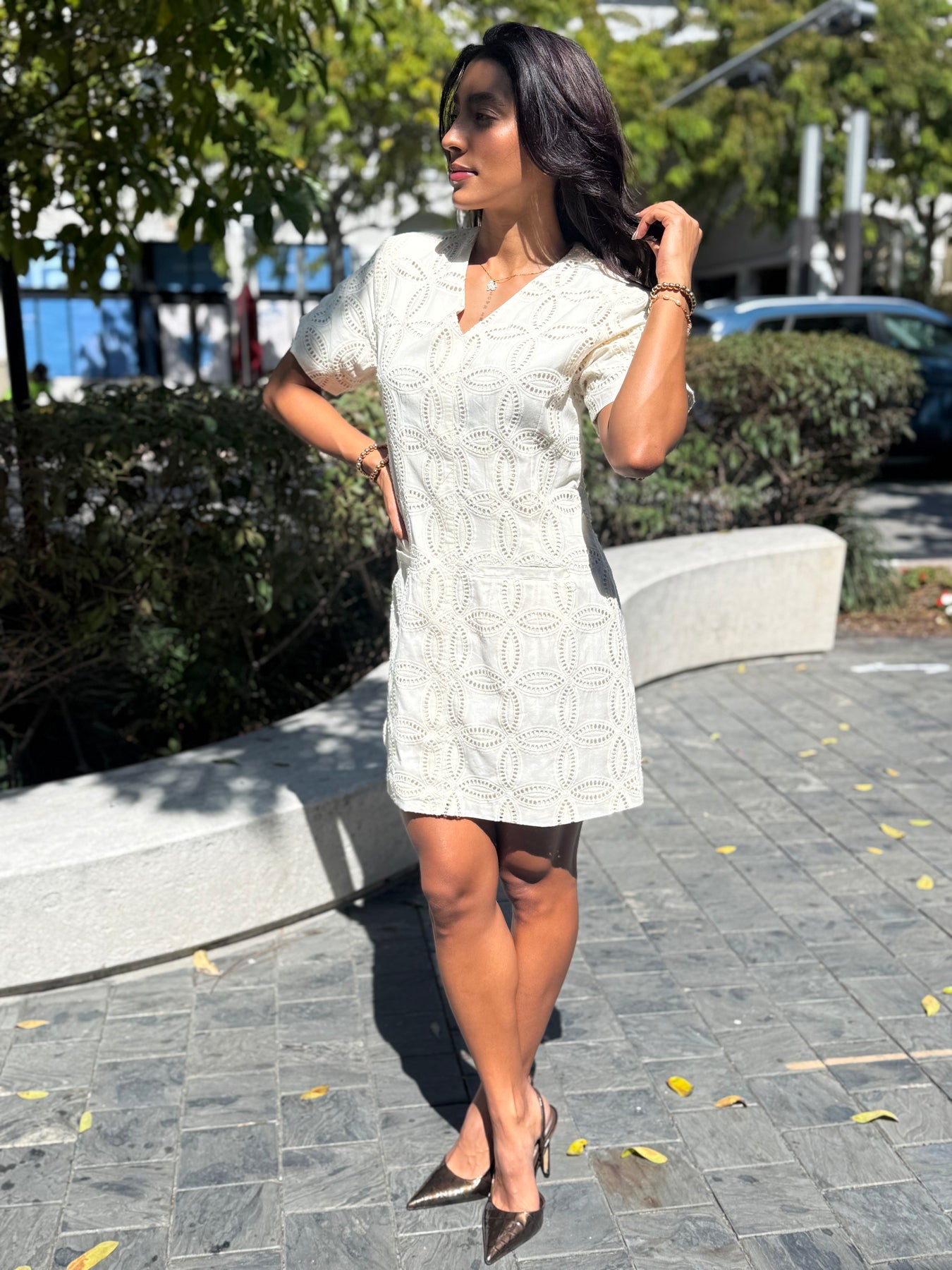 This versatile ecru dress pairs beautifully with nude or tan heels for a monochromatic look, or add a pop of color with blush or sage accessories. Perfect with delicate gold jewelry and a structured clutch for formal events, or dress down with sandals and a straw hat for daytime elegance.
