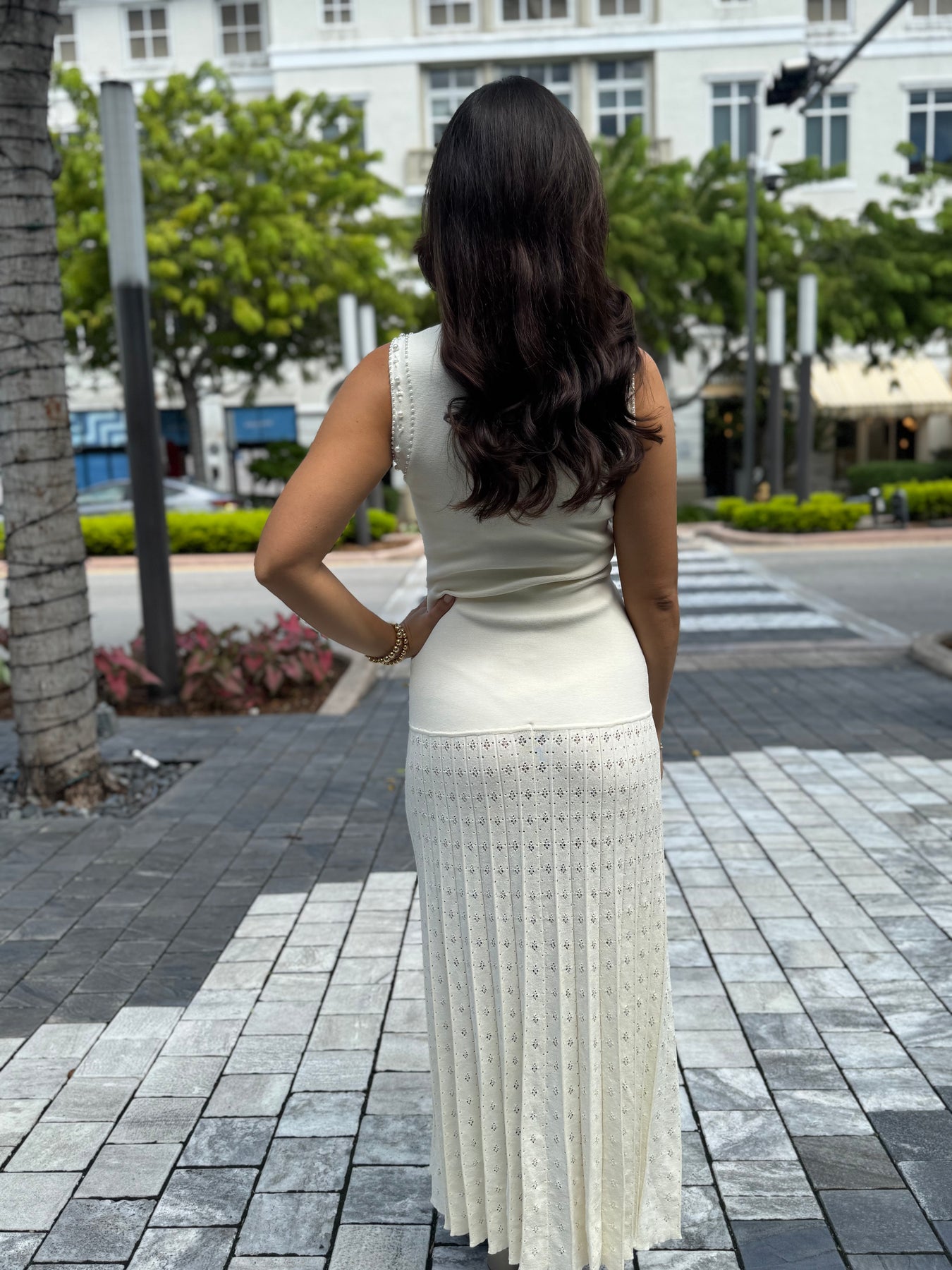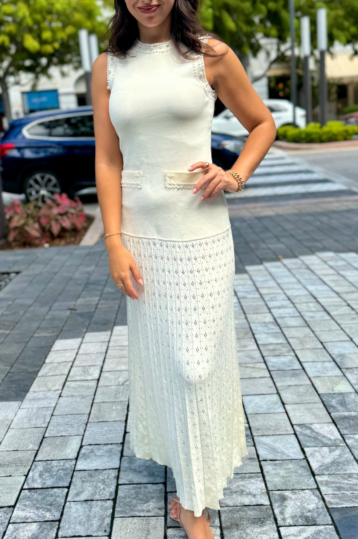 This elegant Viva Knit Maxi Dress is the perfect addition to your wardrobe. Made with soft and comfortable knit fabric, it features delicate pearl details around the neck and proud sleeves for a touch of sophistication. The off-white color adds a timeless and versatile touch to any outfit.