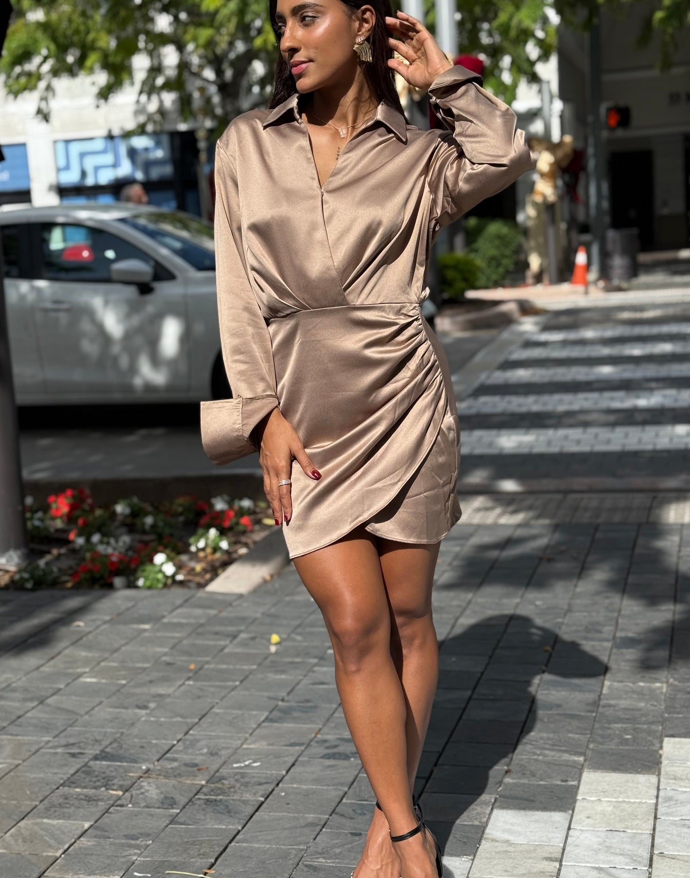 "Featuring a luxurious satin fabric, this Yady Dress is designed with a flattering v-neckline, long sleeves, and a form-fitting silhouette. Stay effortlessly stylish and elegant in this mini dress, perfect for any occasion."