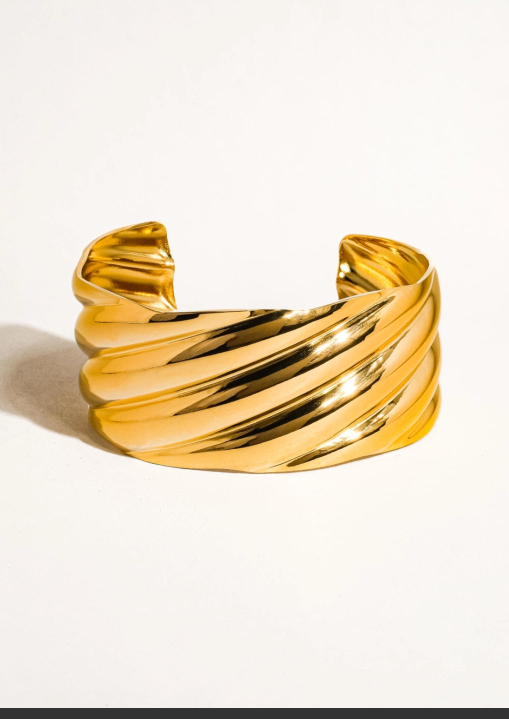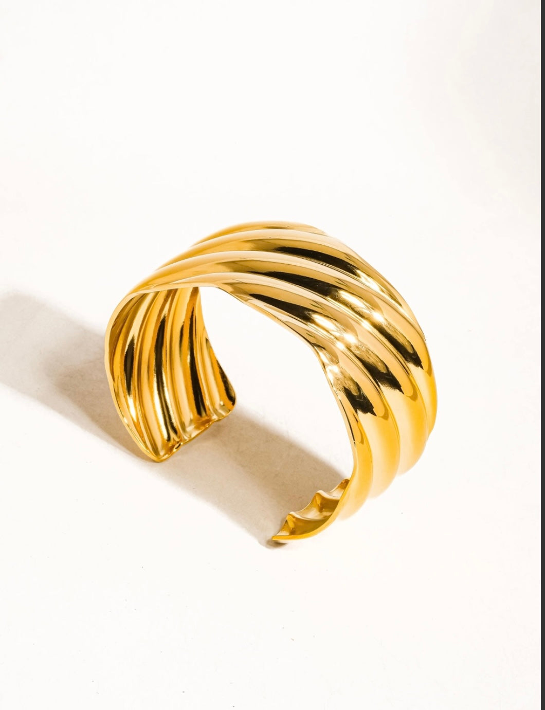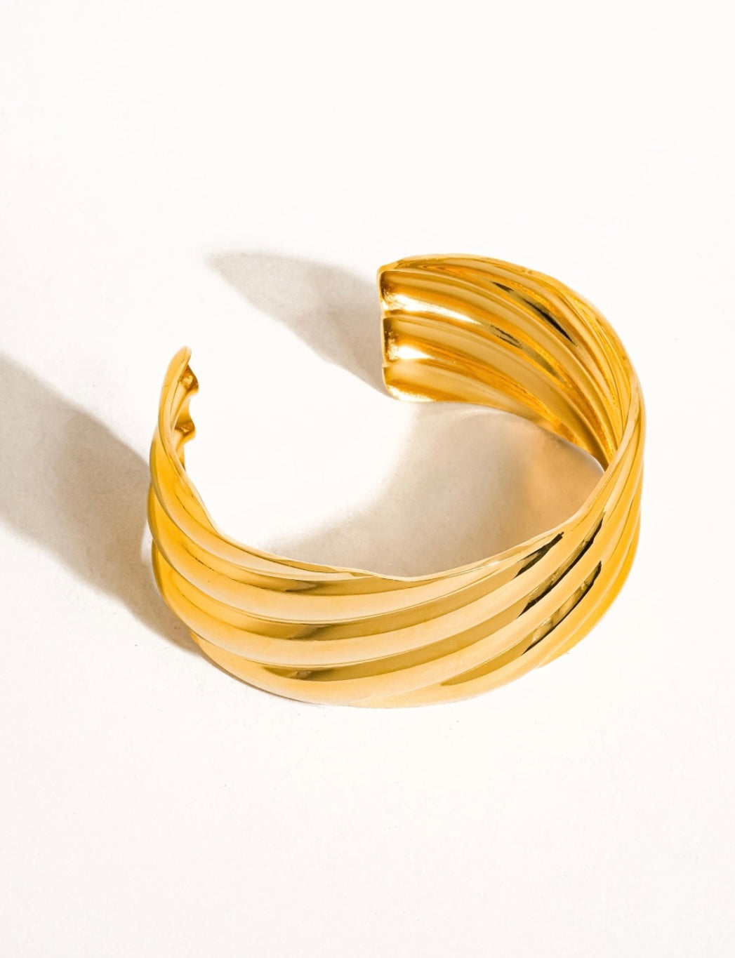 The Mimi Bold Bangle features a distinctive wavy design crafted to resist tarnishing. Make a confident style statement with this striking accessory that maintains its brilliance wear after wear.