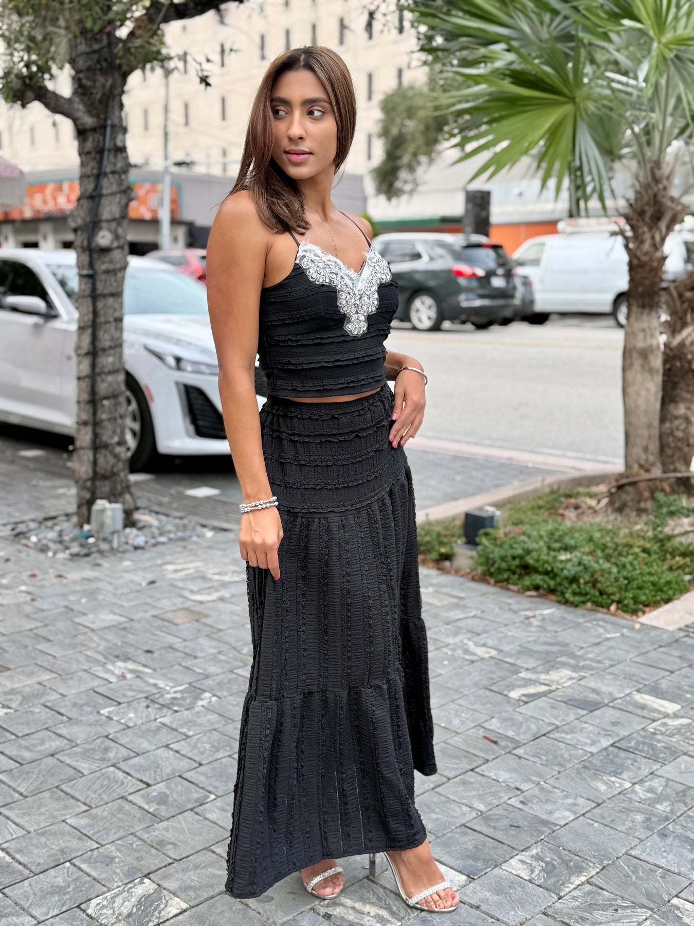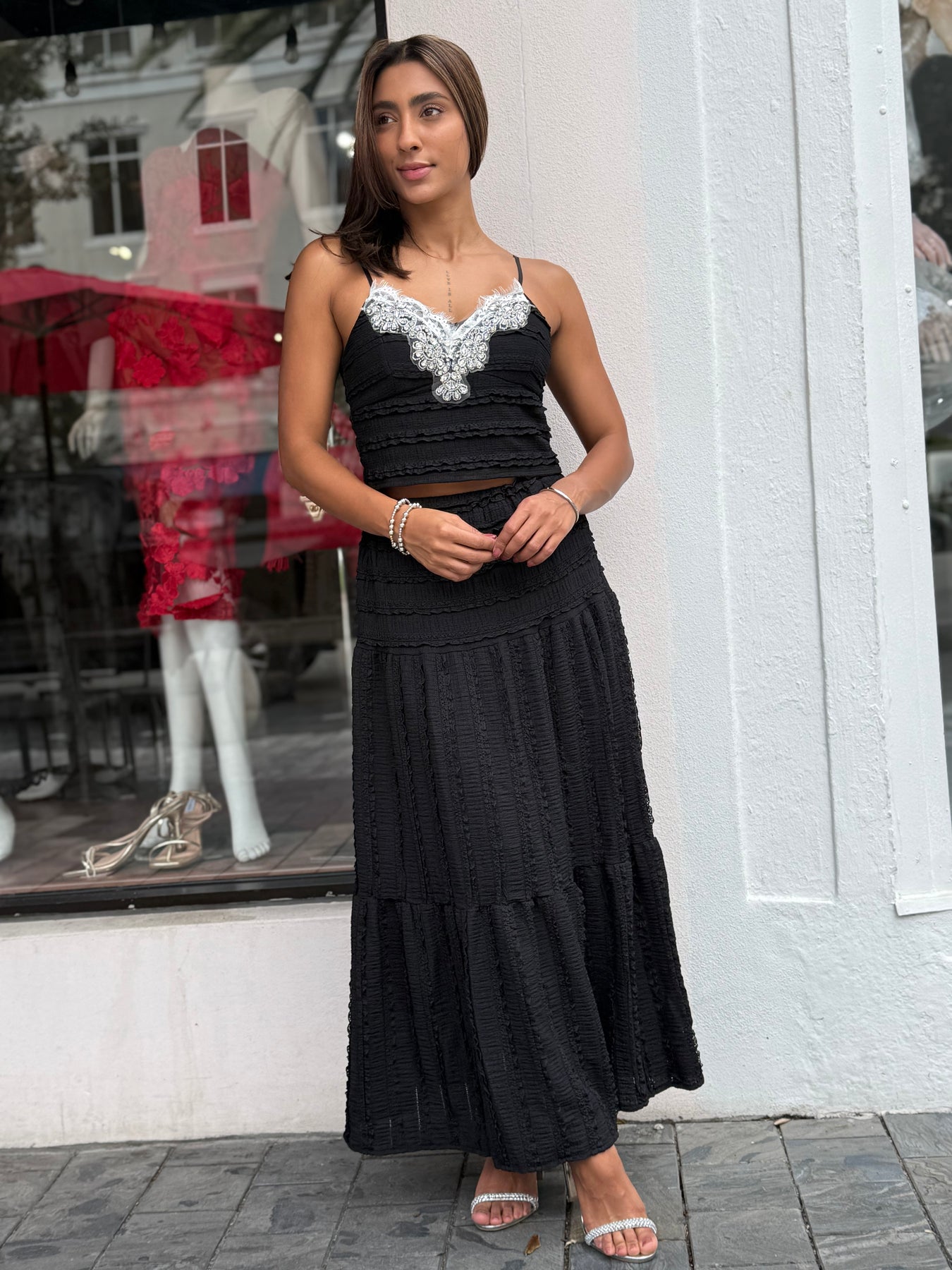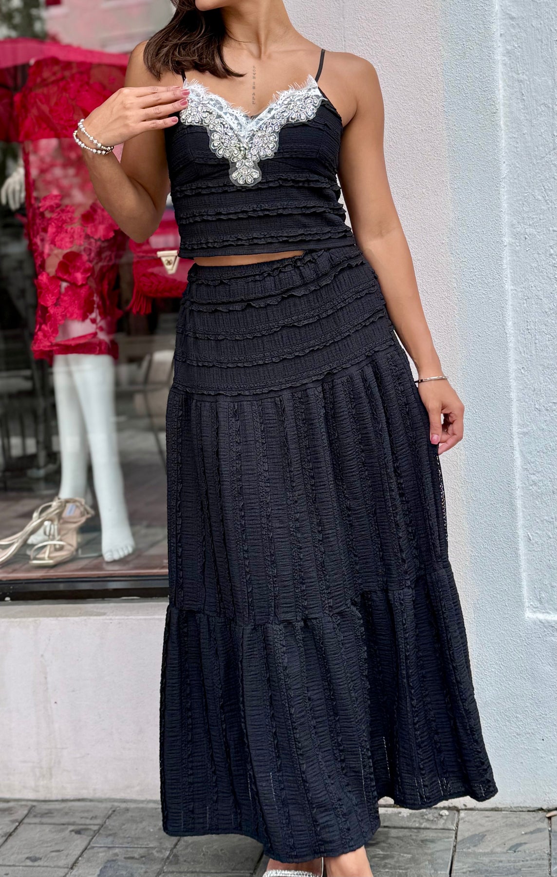 Enhance your wardrobe with the Emma Crop Top & Maxi Skirt Set, a captivating lace ensemble that embodies pure romance.