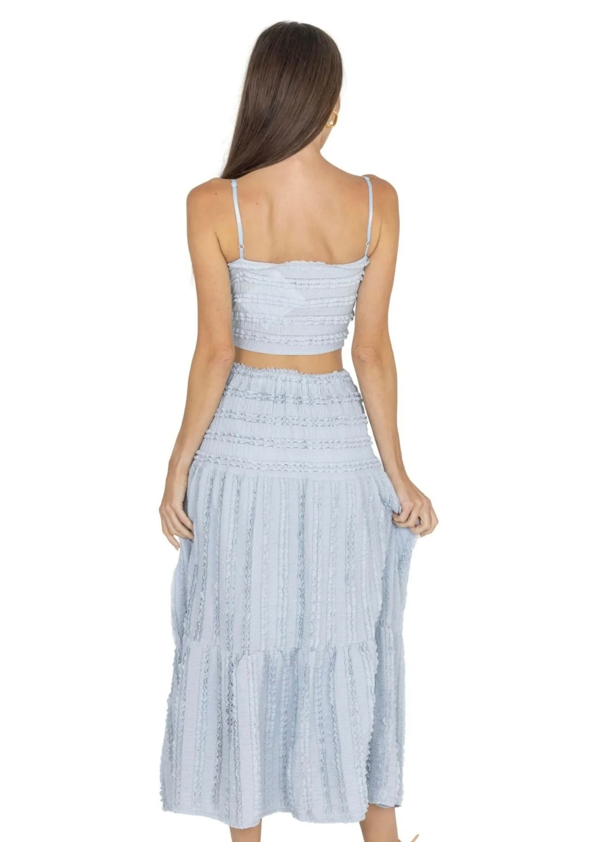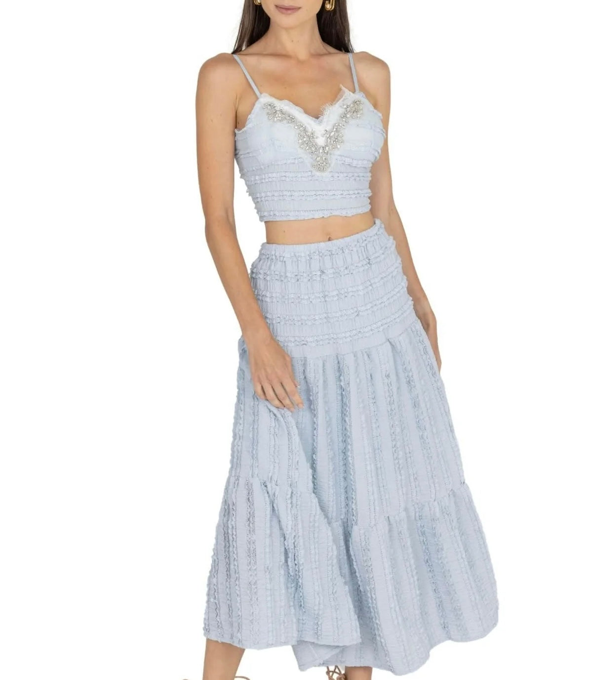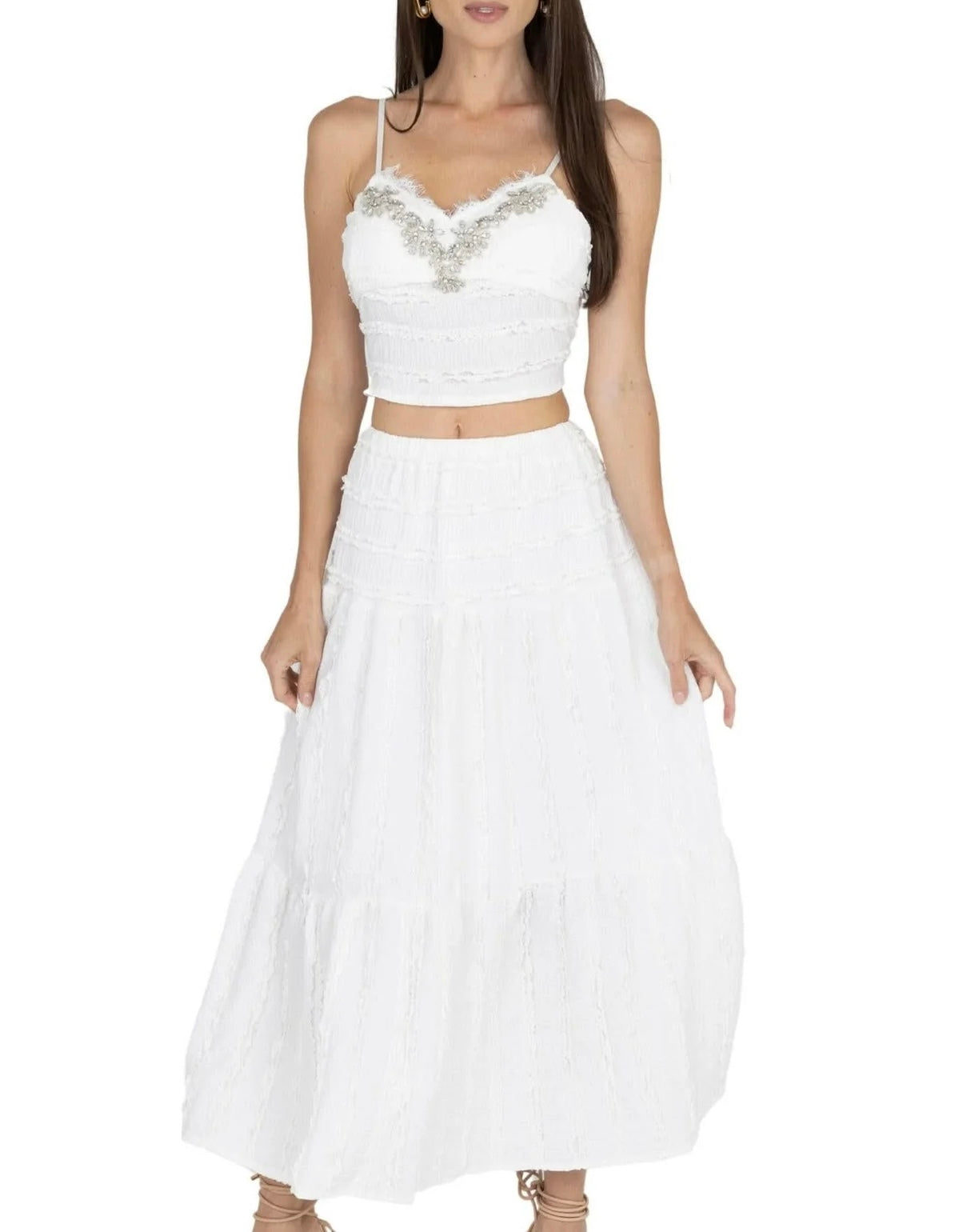 Enhance your wardrobe with the Emma Crop Top & Maxi Skirt Set, a captivating lace ensemble that embodies pure romance.