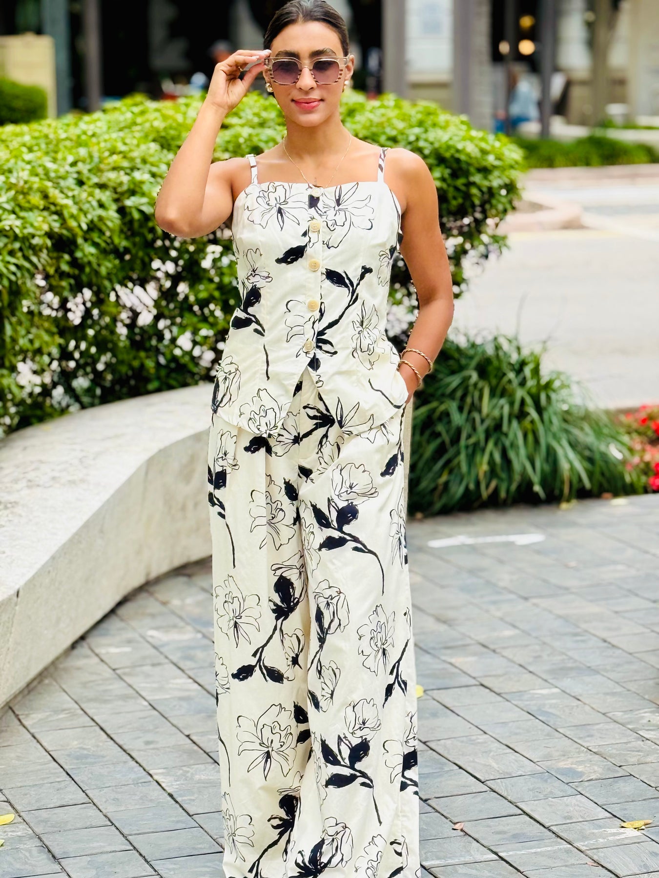 The Kristell Set in cream and black features a coordinated top and pants design, incorporating a button-down round neck and sleeves for elegant styling. This two-piece set provides versatility, suitable for various occasions. The contrasting colors enhance visual appeal, making it a practical addition to any wardrobe.