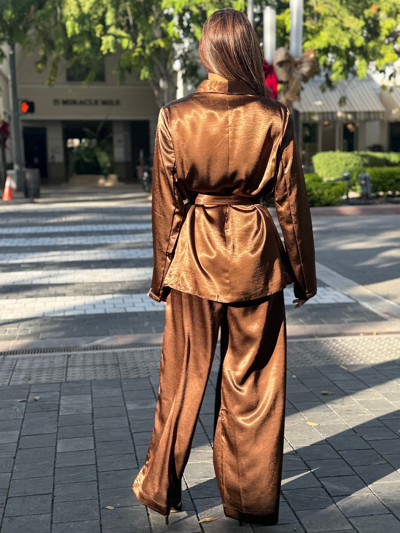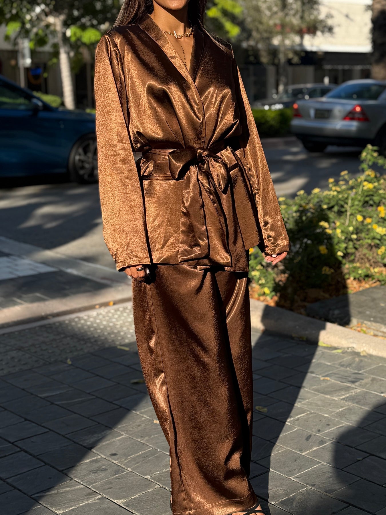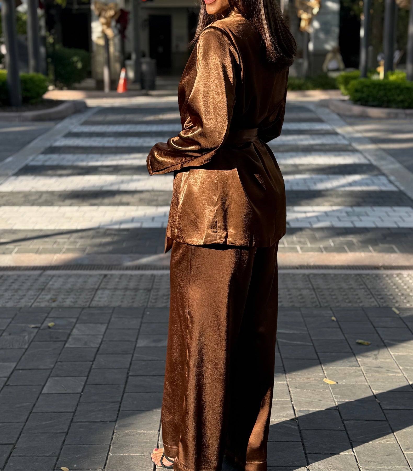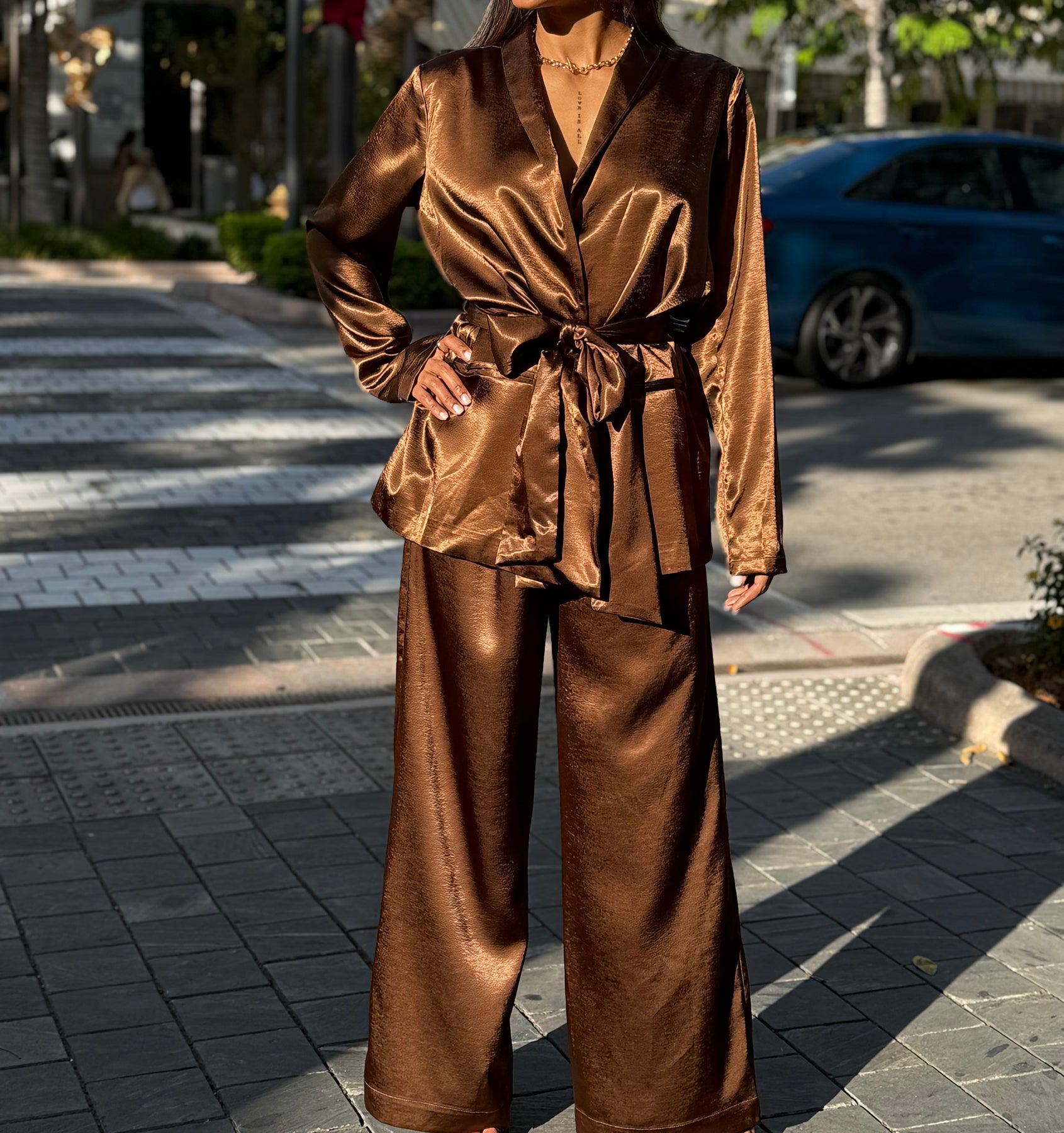 These brown set is equipped with convenient pockets while the wrap jacket features a belted satin finish. The perfect balance of style and functionality in one set.
