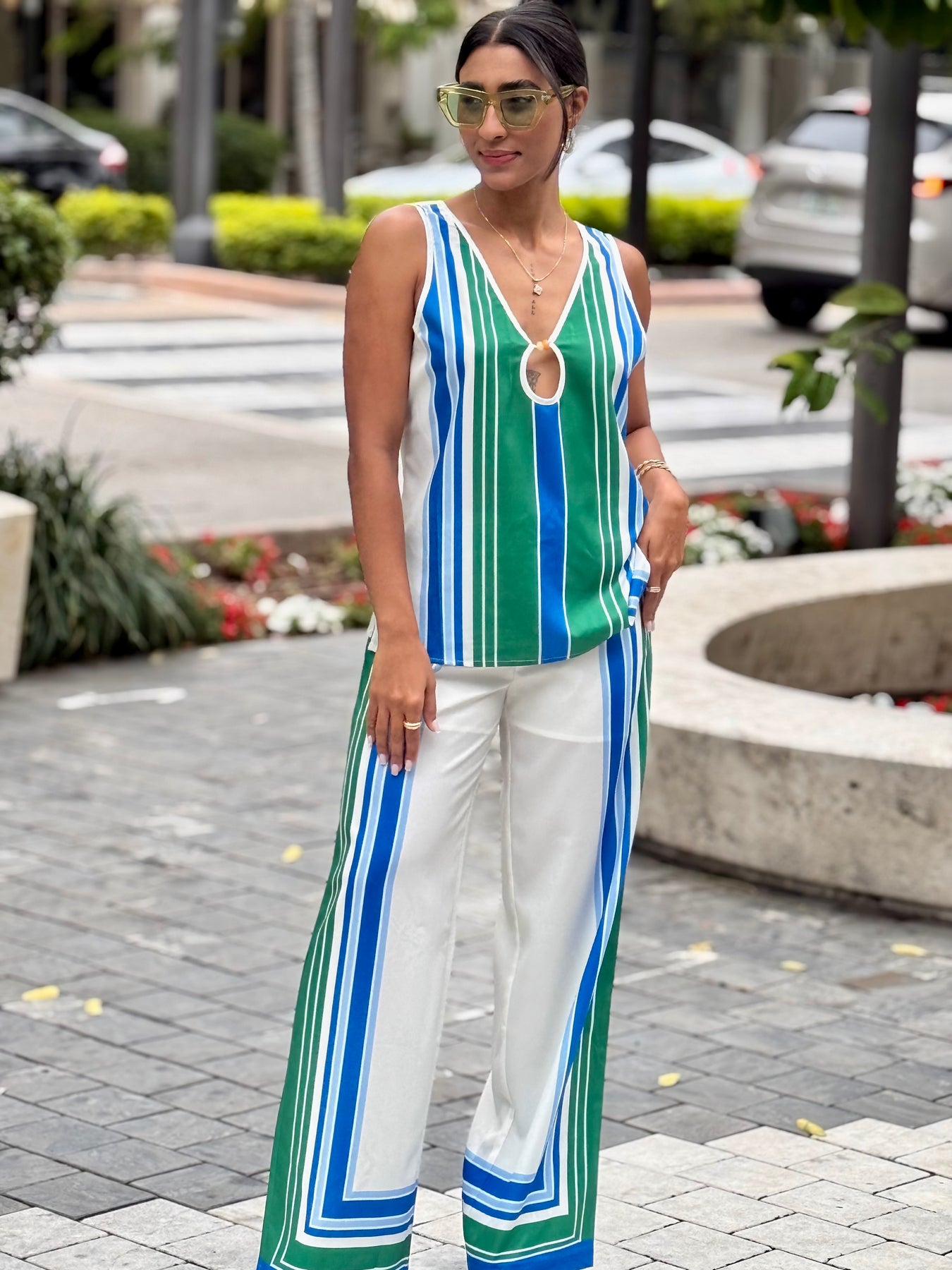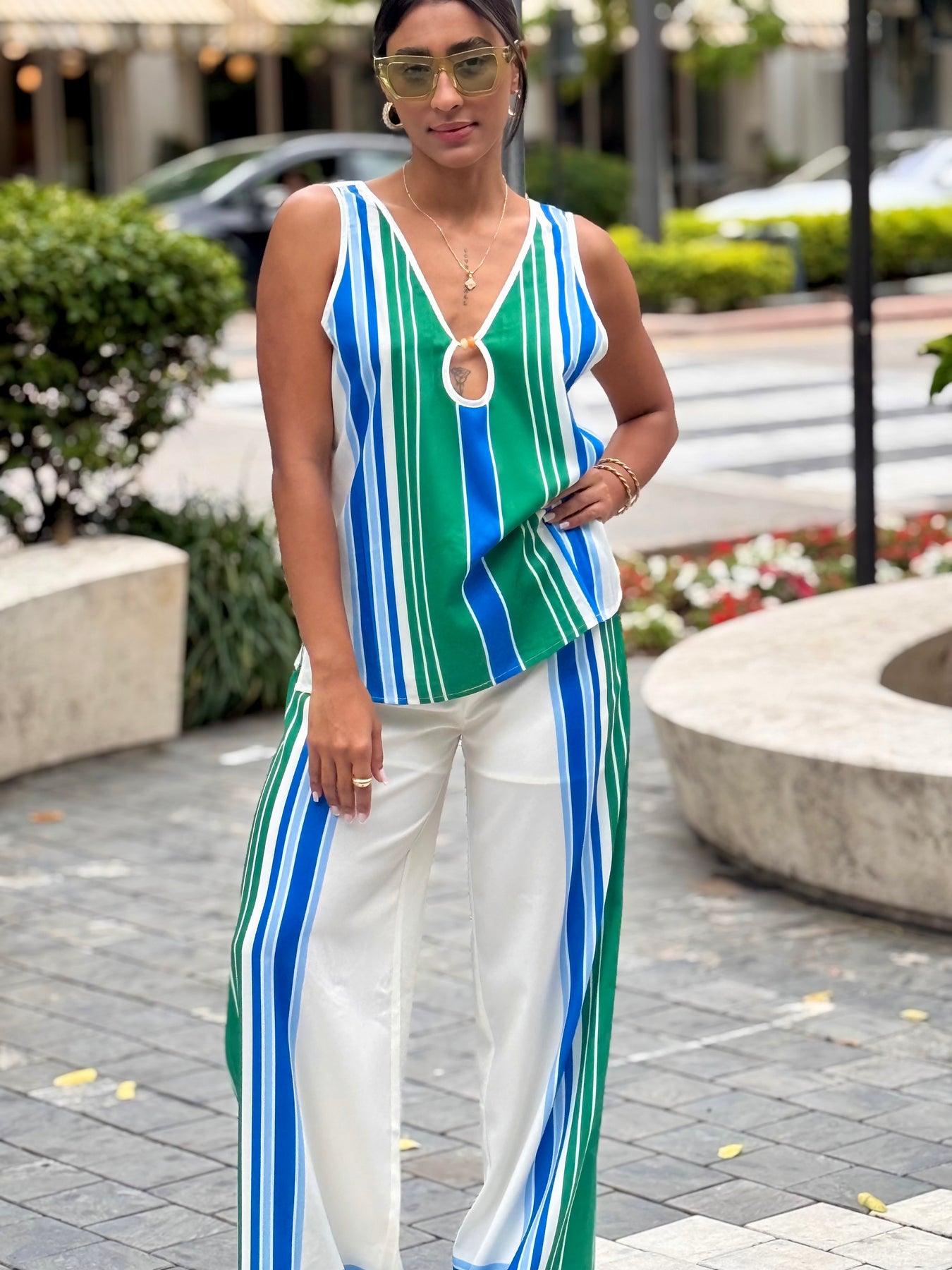 The Patricia Multi set presents a contemporary, resort-inspired design, suitable for warm weather occasions. Its striped pattern enhances visual appeal while ensuring a polished look. Ideal for day outings, vacations, and casual events, this set combines ease with sophistication for versatile styling.
