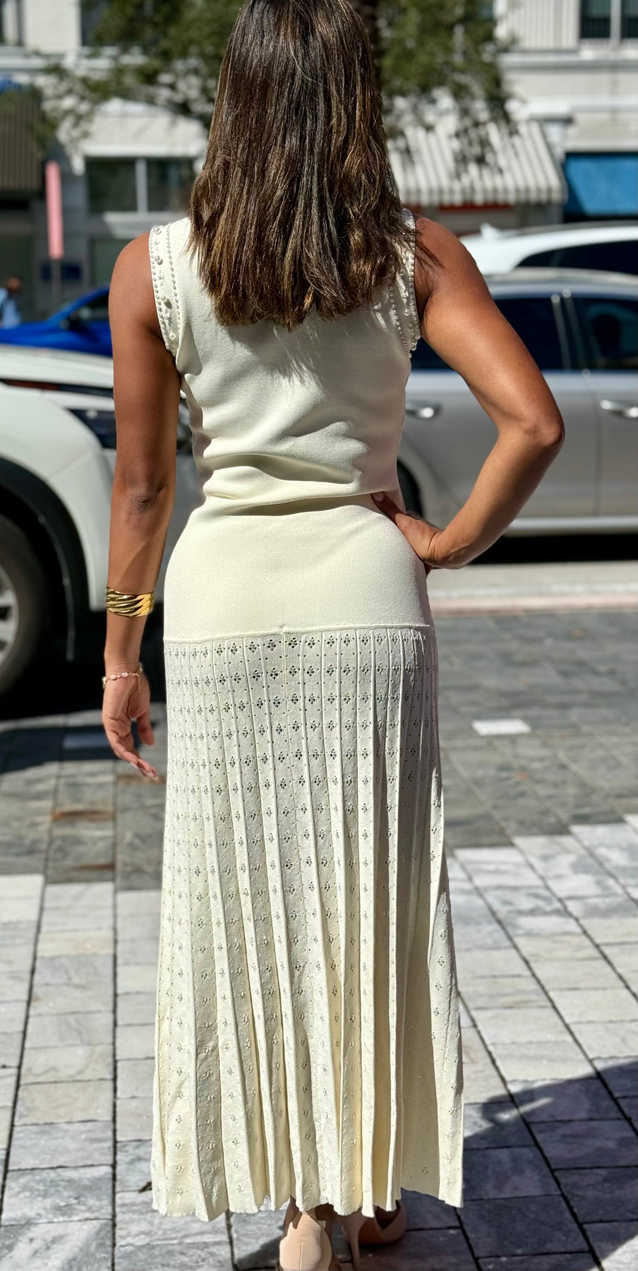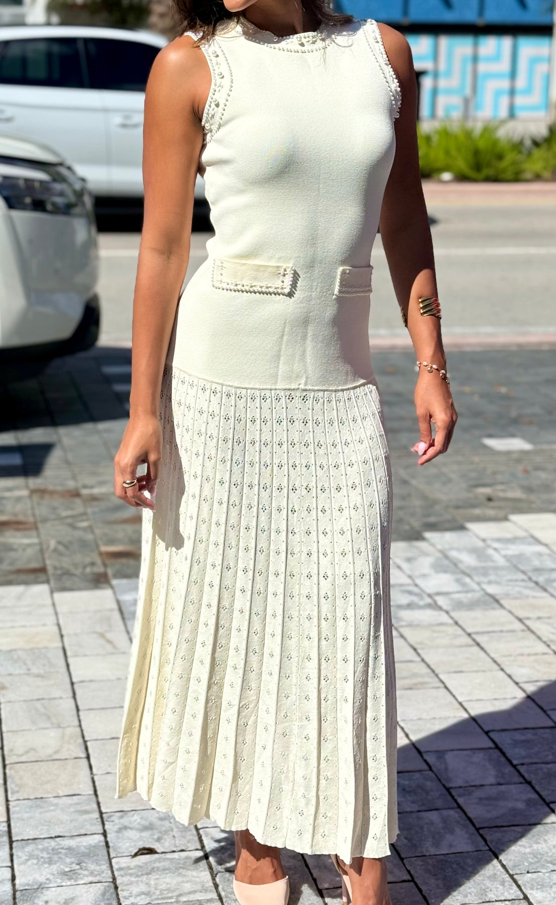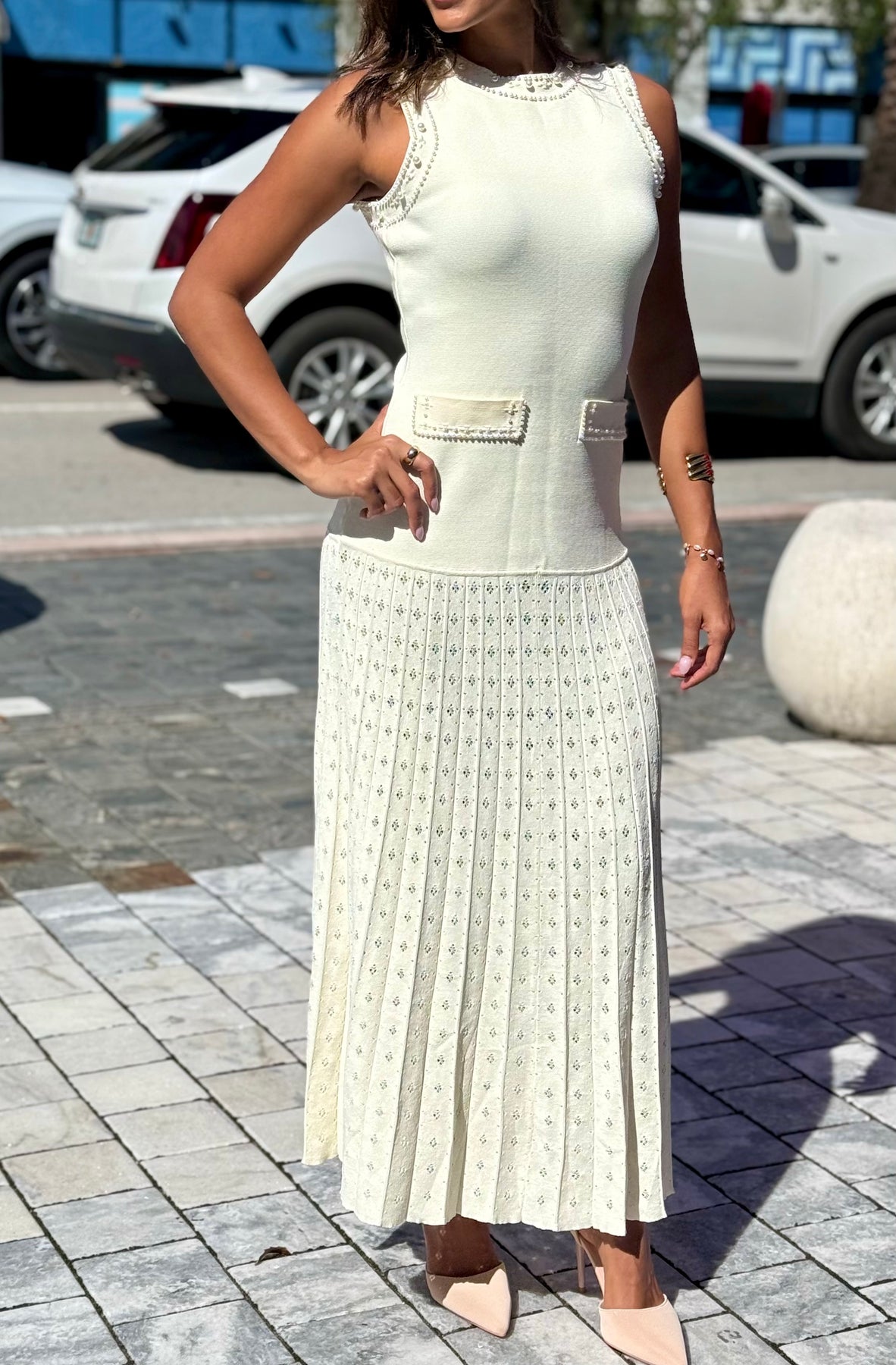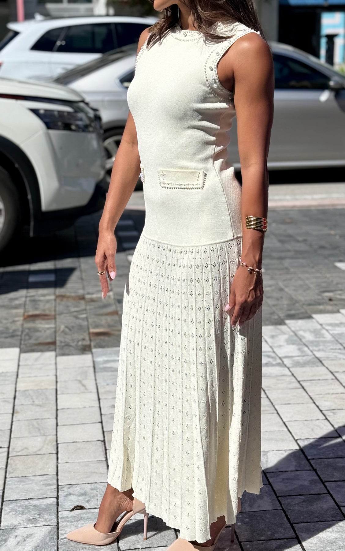 This elegant Viva Knit Maxi Dress is the perfect addition to your wardrobe. Made with soft and comfortable knit fabric, it features delicate pearl details around the neck and proud sleeves for a touch of sophistication. The off-white color adds a timeless and versatile touch to any outfit.