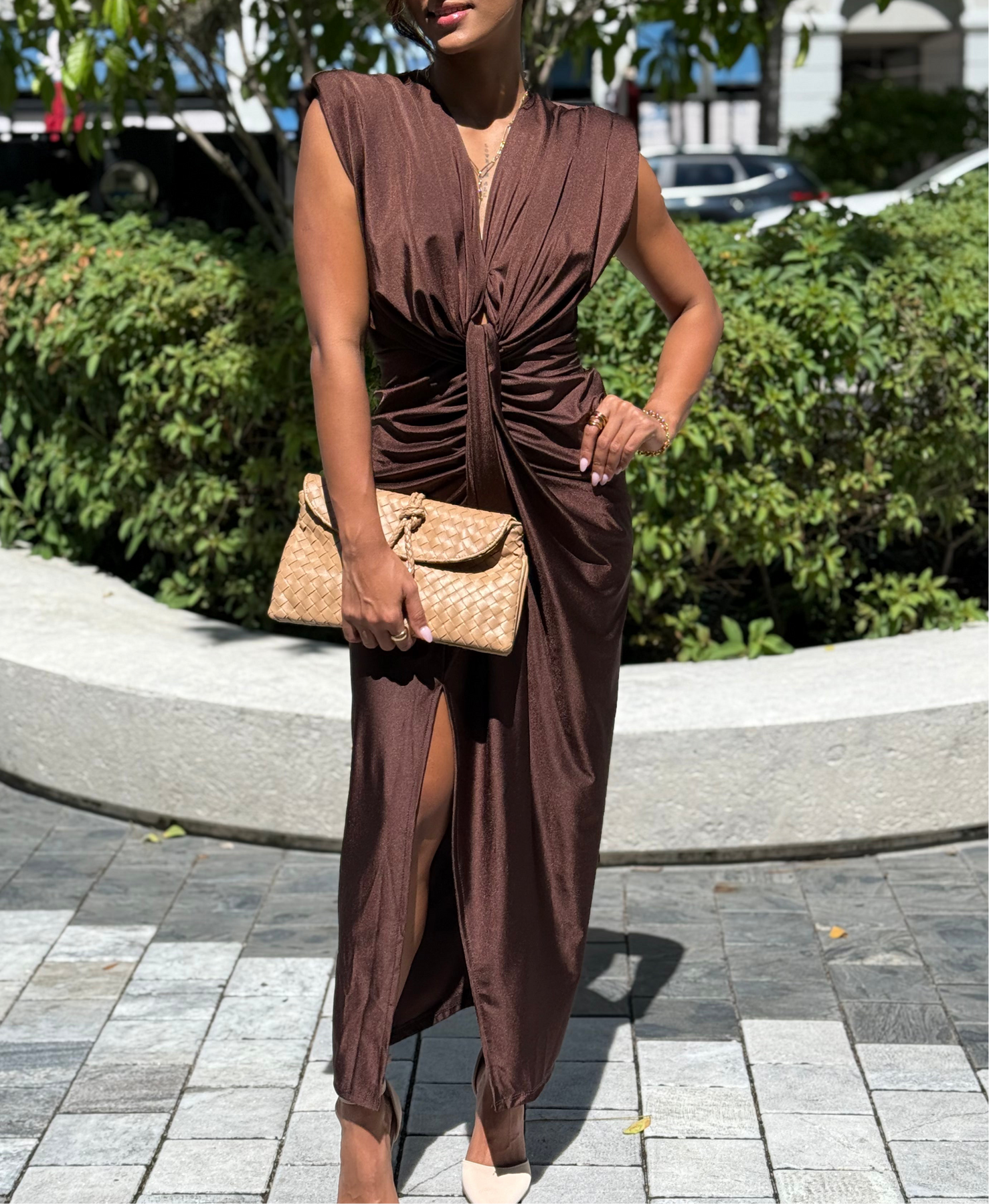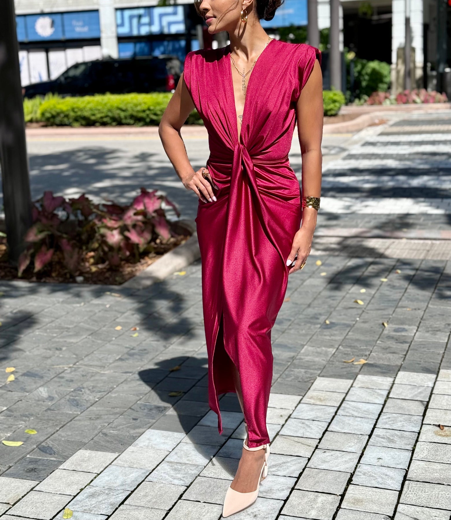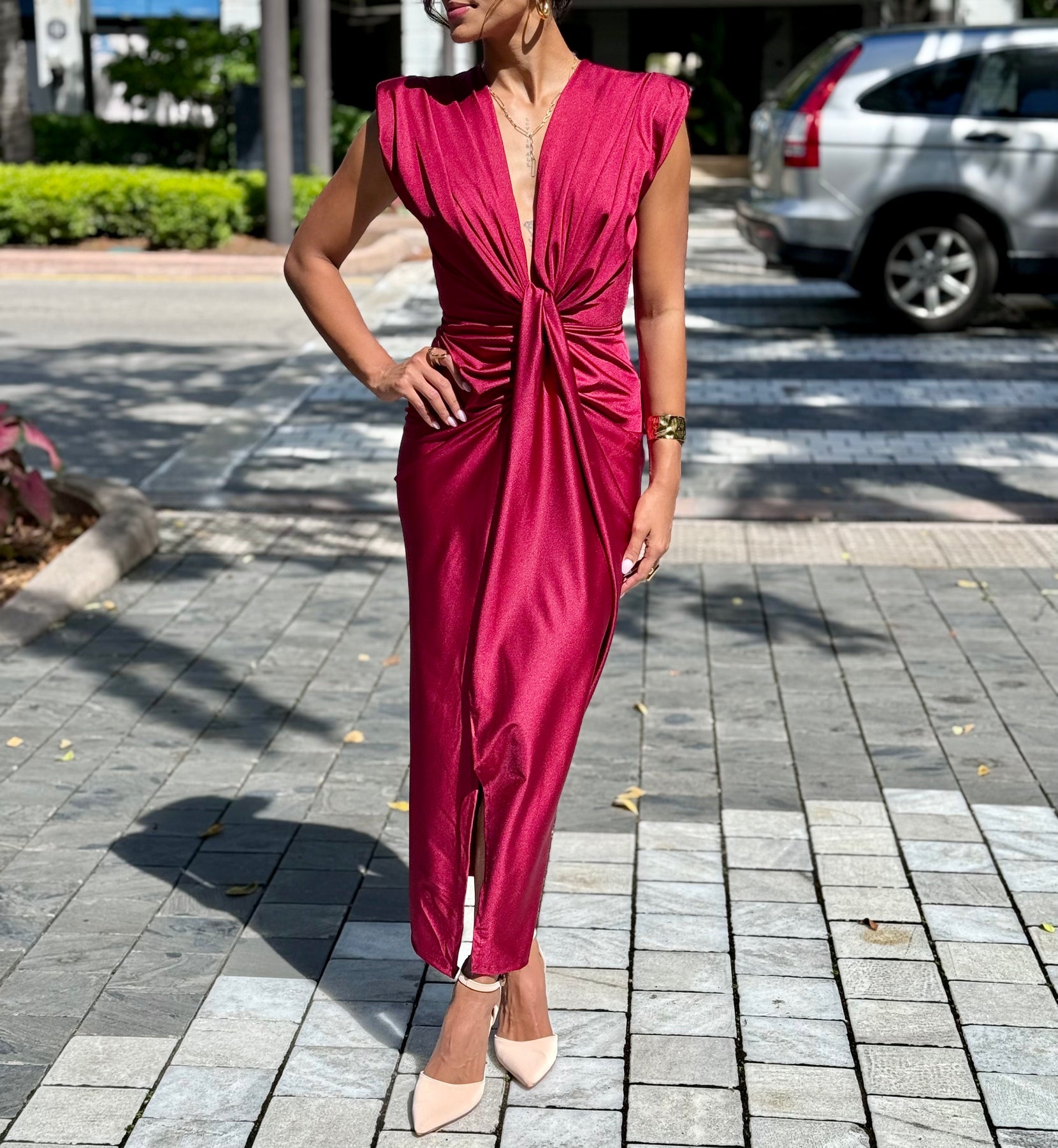 Designed with a deep open v neckline and sleeveless cut, this dress will effortlessly enhance your curves while keeping you comfortable all day long. Perfect for any occasion, take your wardrobe to the next level with this must-have piece.