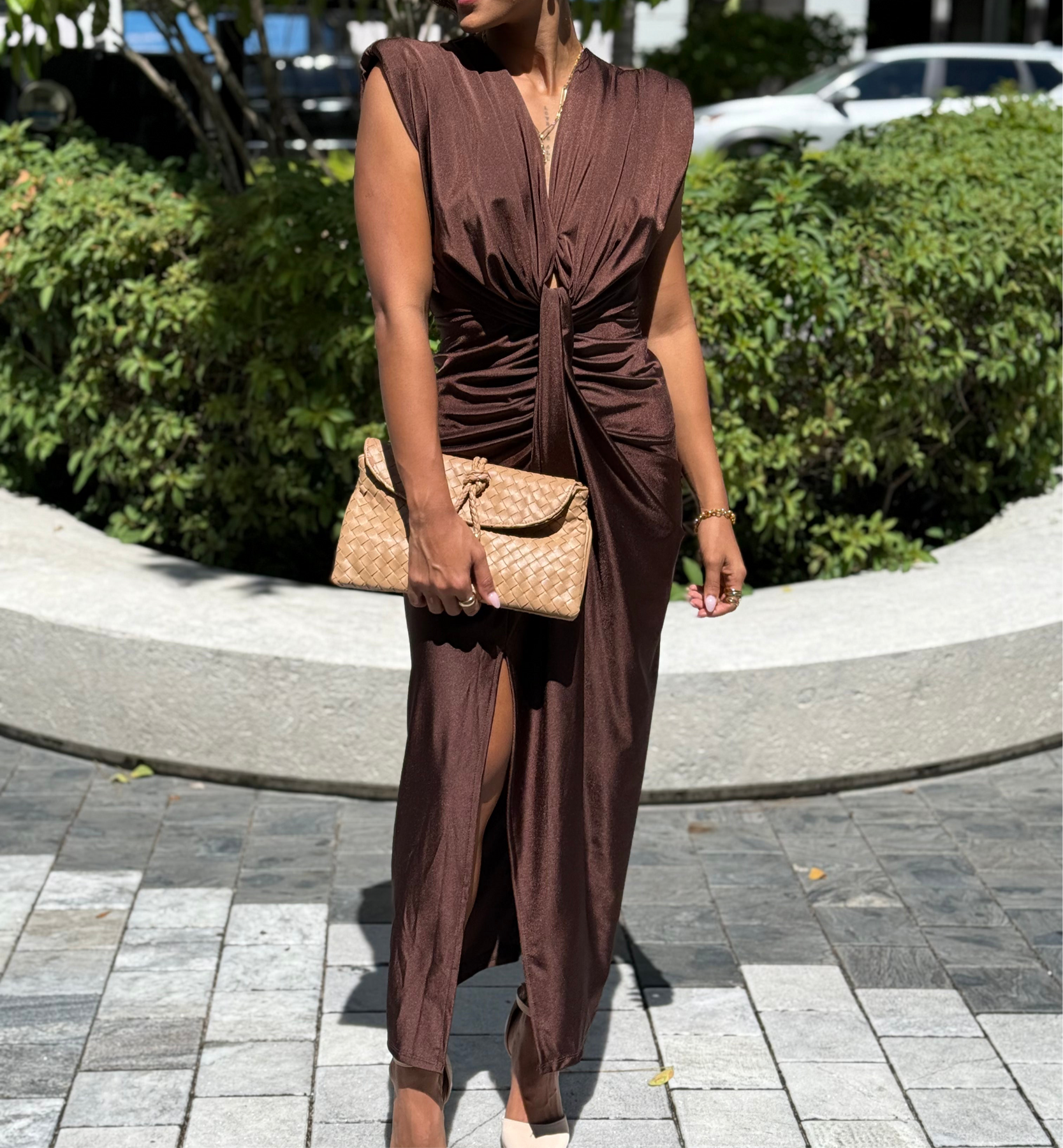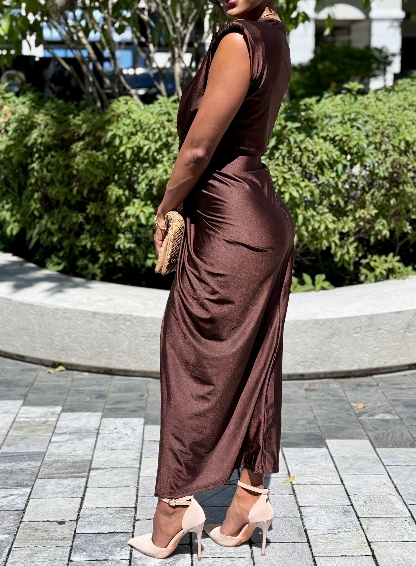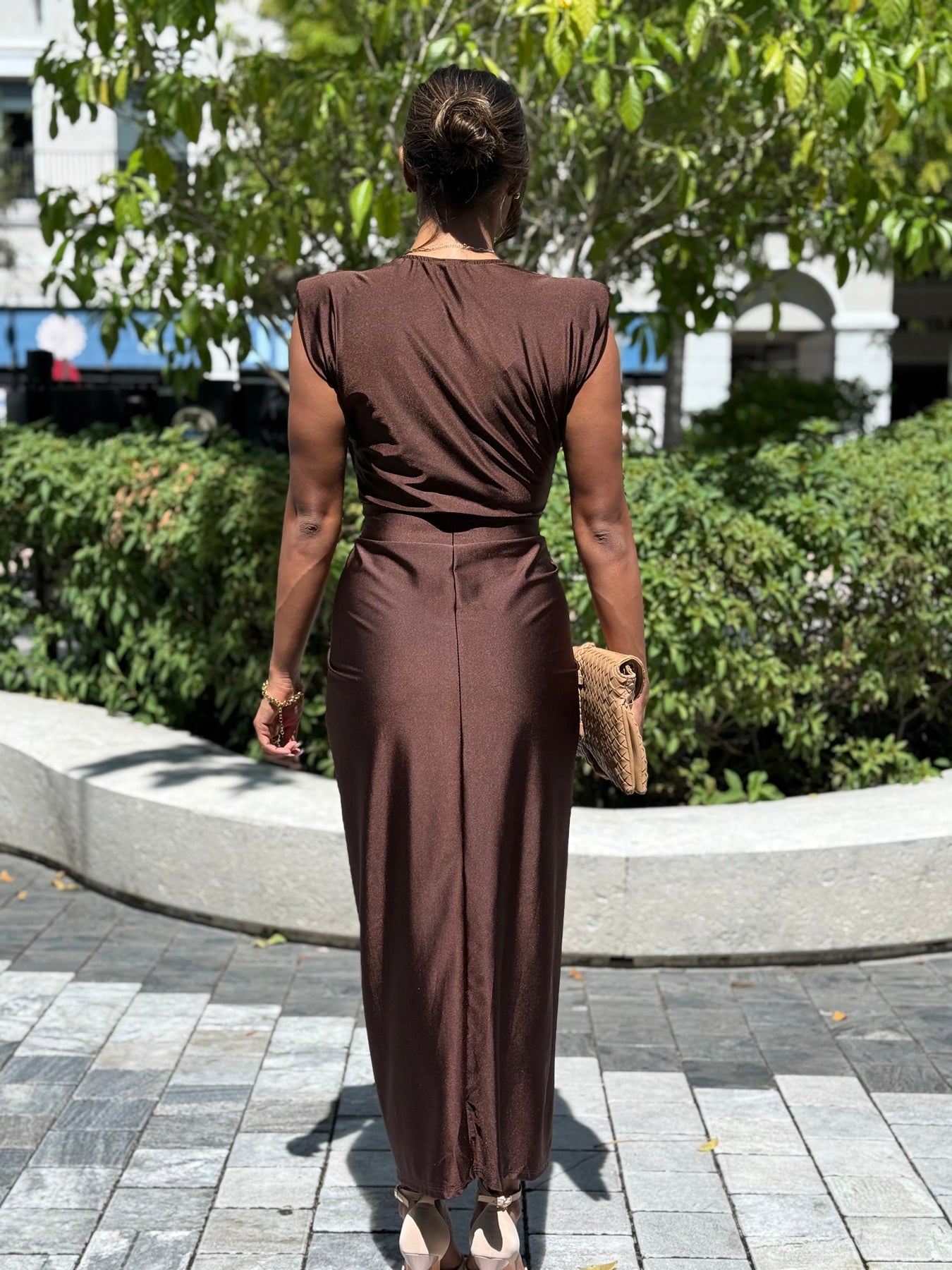 Designed with a deep open v neckline and sleeveless cut, this dress will effortlessly enhance your curves while keeping you comfortable all day long. Perfect for any occasion, take your wardrobe to the next level with this must-have piece.